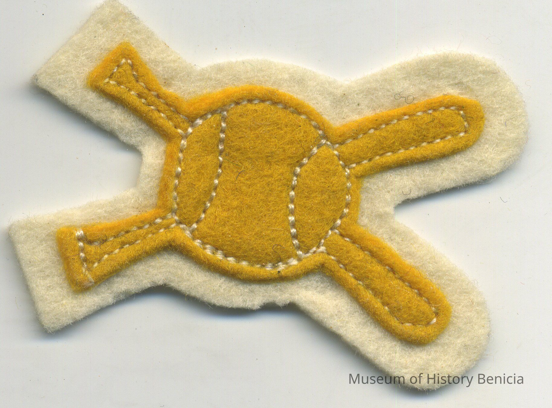 This is a school patch for Benicia High School baseball. It is a baseball and two bats on felt cloth. It is yellow in color and about 2 inches in width.Collection