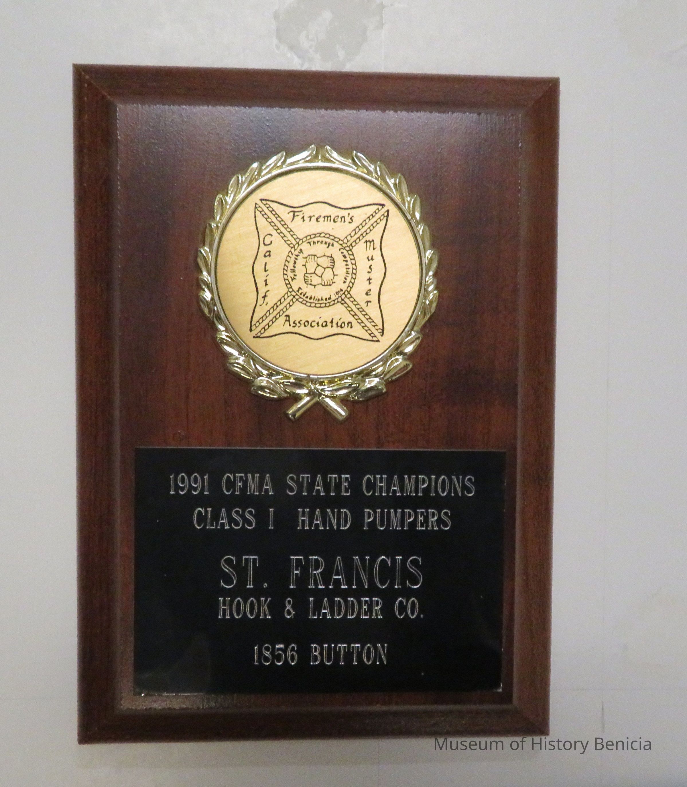 Wood plaque with gold plastic embled and black tin with gold lettering below emblem. On gold emblem is written California Firemen's Muster Association. On black tin is inscribed 1991 CFMA State Champions Class 1 Hand Pumpers, St. Francis Hook and Ladder Co., 1856 ButtonCollection