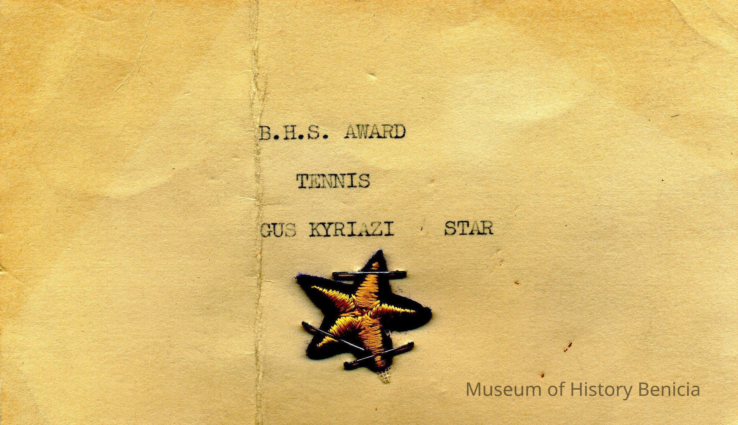 This is a star awarded to Gus Kyriazi of Benicia High School about 1938 to 1940 when he graduated. The star is for his playing tennis. It is stapled to a small card and is in blue and gold colors.Collection