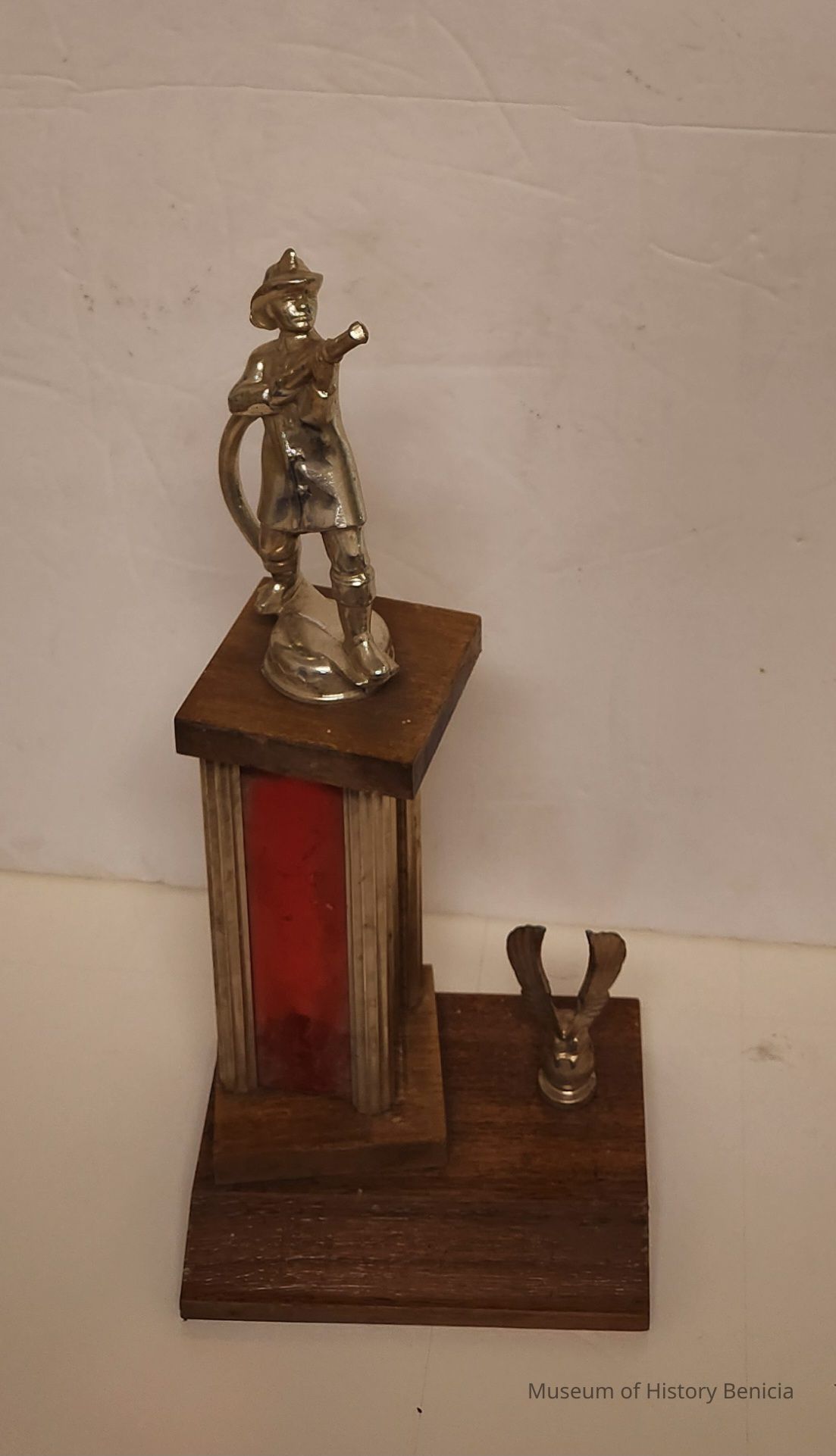Trophy - wood base with plastic column, red insert, and a wood square on top holding a fireman figure with a hose; a wings open eagle is to the right of the column on the base.Collection