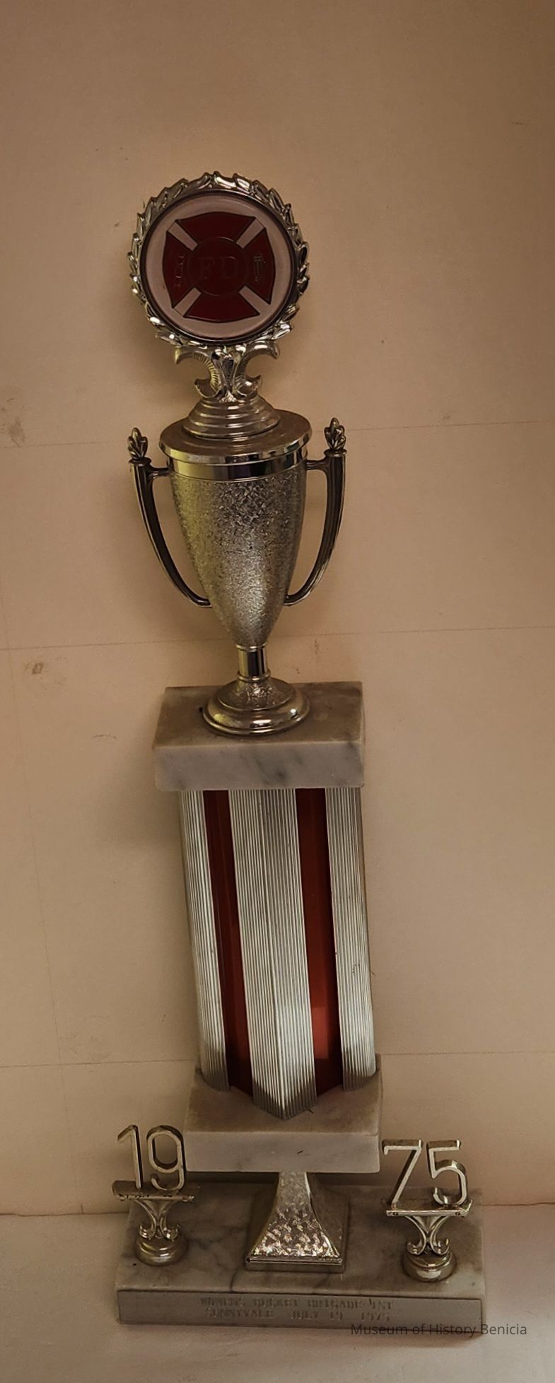 Trophy - marble base with silver metal plate on the front and "19" and "75" on risers on either side of the center column; column is silver metal-marble-silver metal with red inserts-marble, metal "loving cup" and red-white logo with silver border medallion on the very topCollection