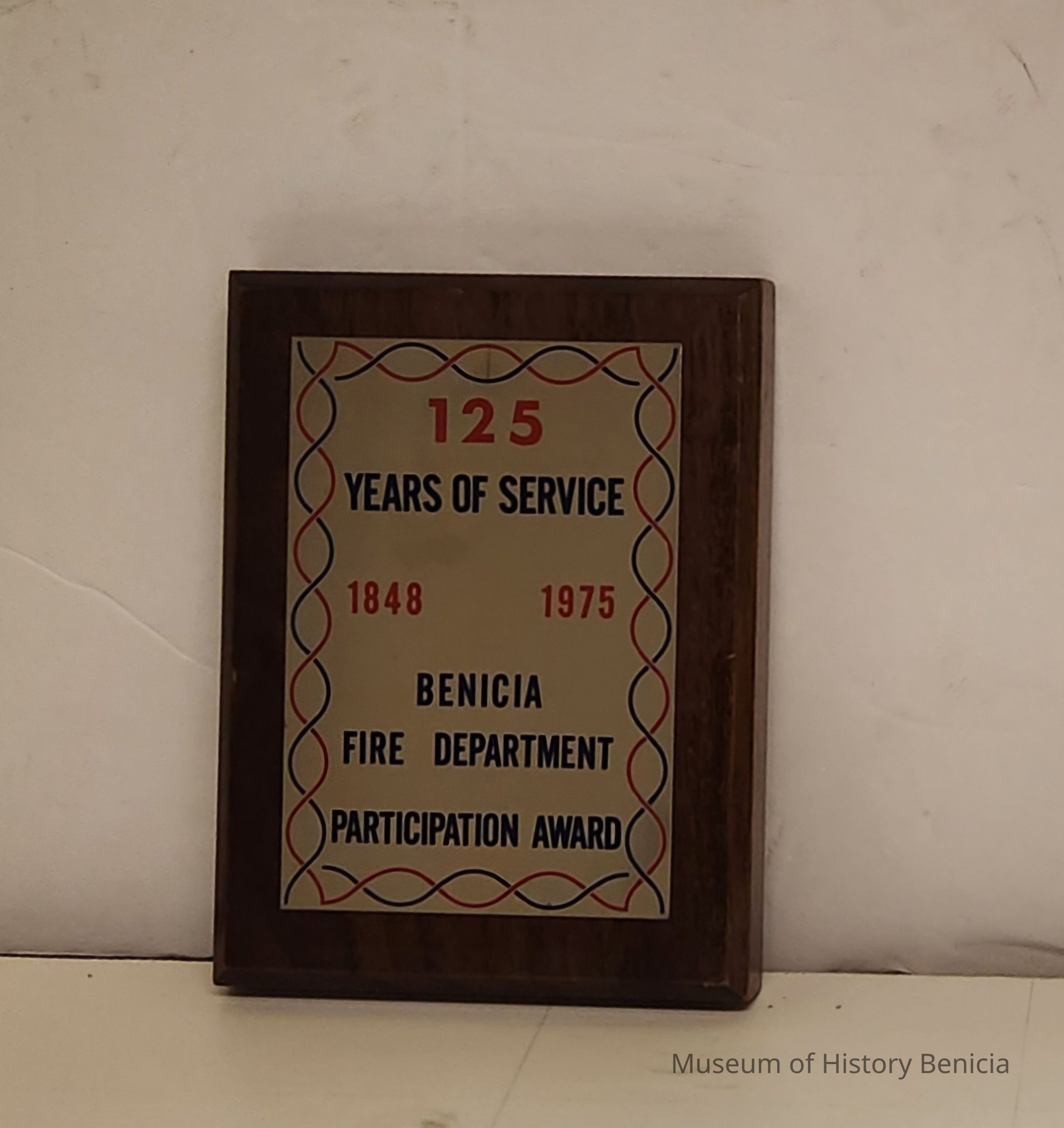 Wooden plaque with brass plate, there is a wavy design in red and black around the edge of the plate.