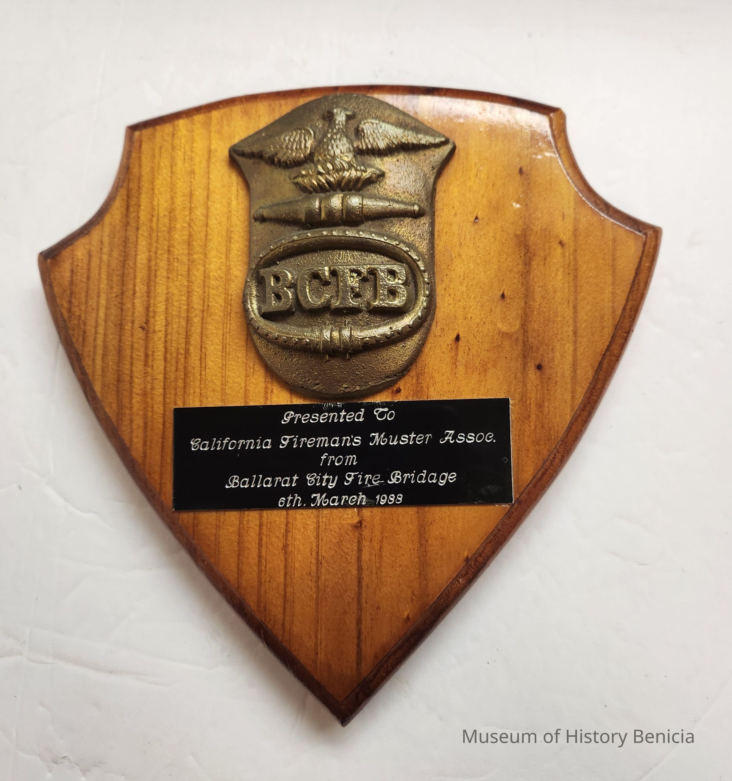 Wood plaque in the shape of a shield with top edges scooped