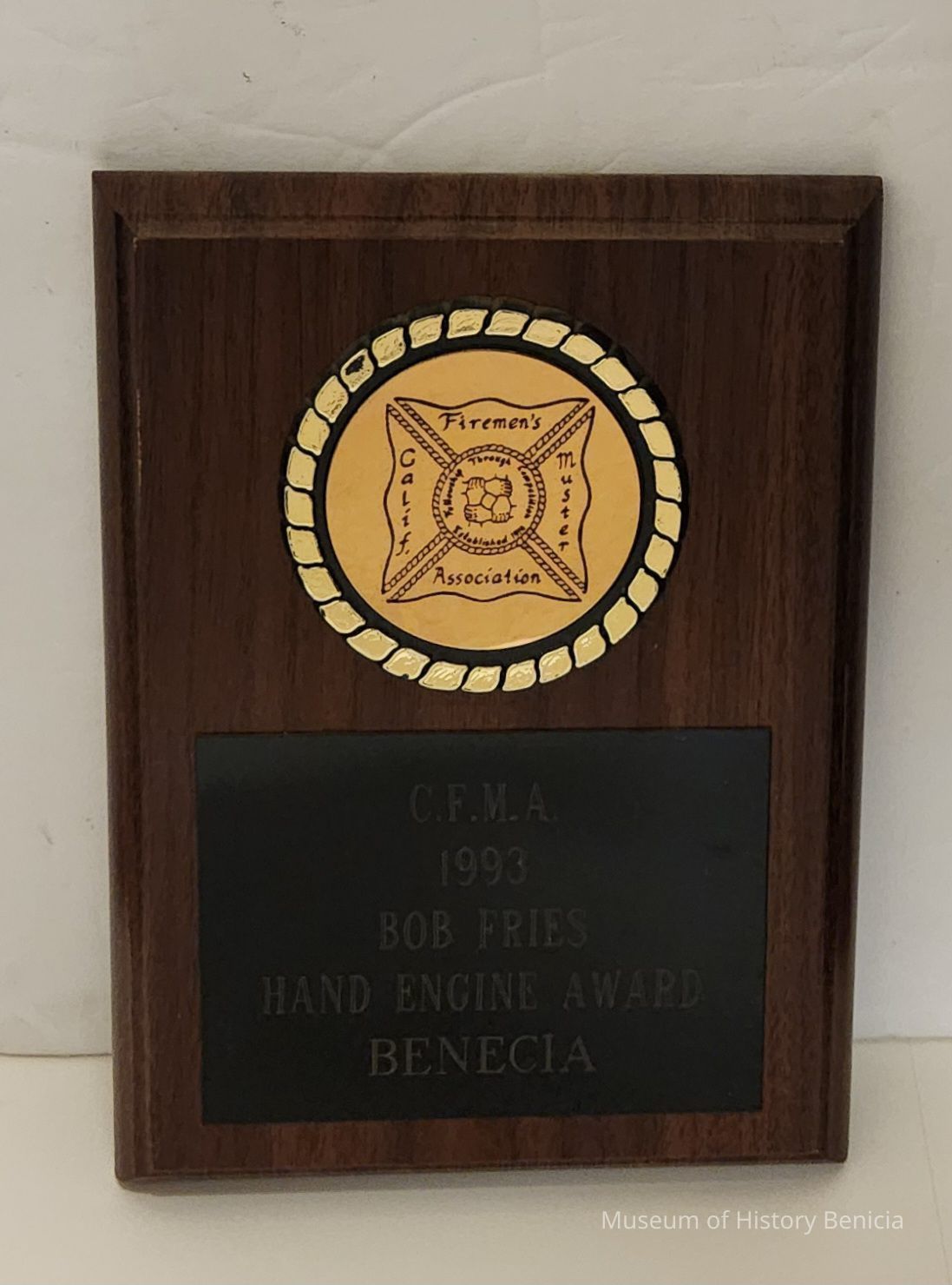 Small wooden plaque with round gold medallion at the top and black plate beneath.