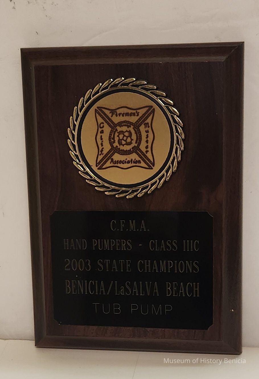 Wooden plaque with gold medallion and black plate