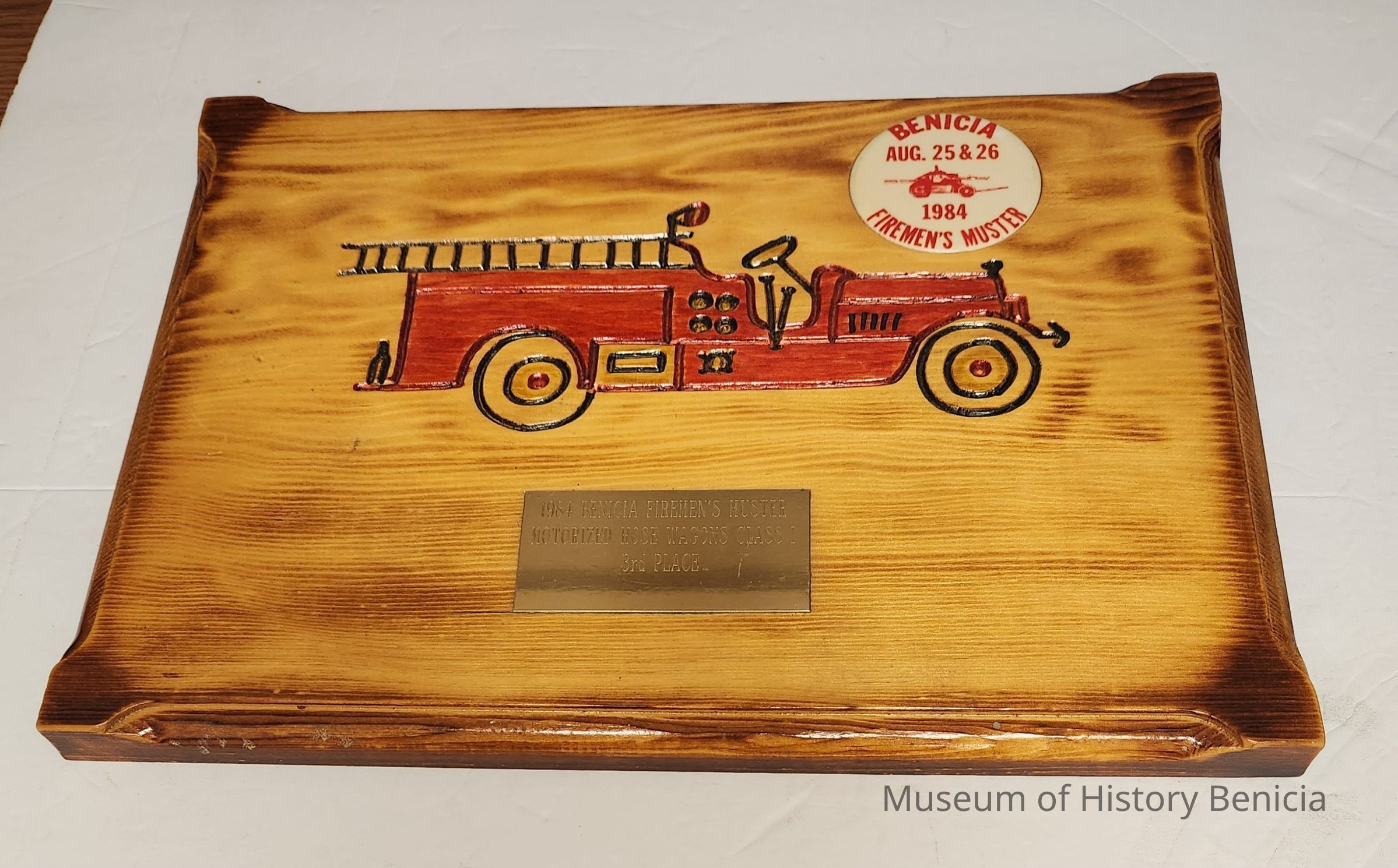 Wood with carved image of a red fire truck, plastic button and brass plate