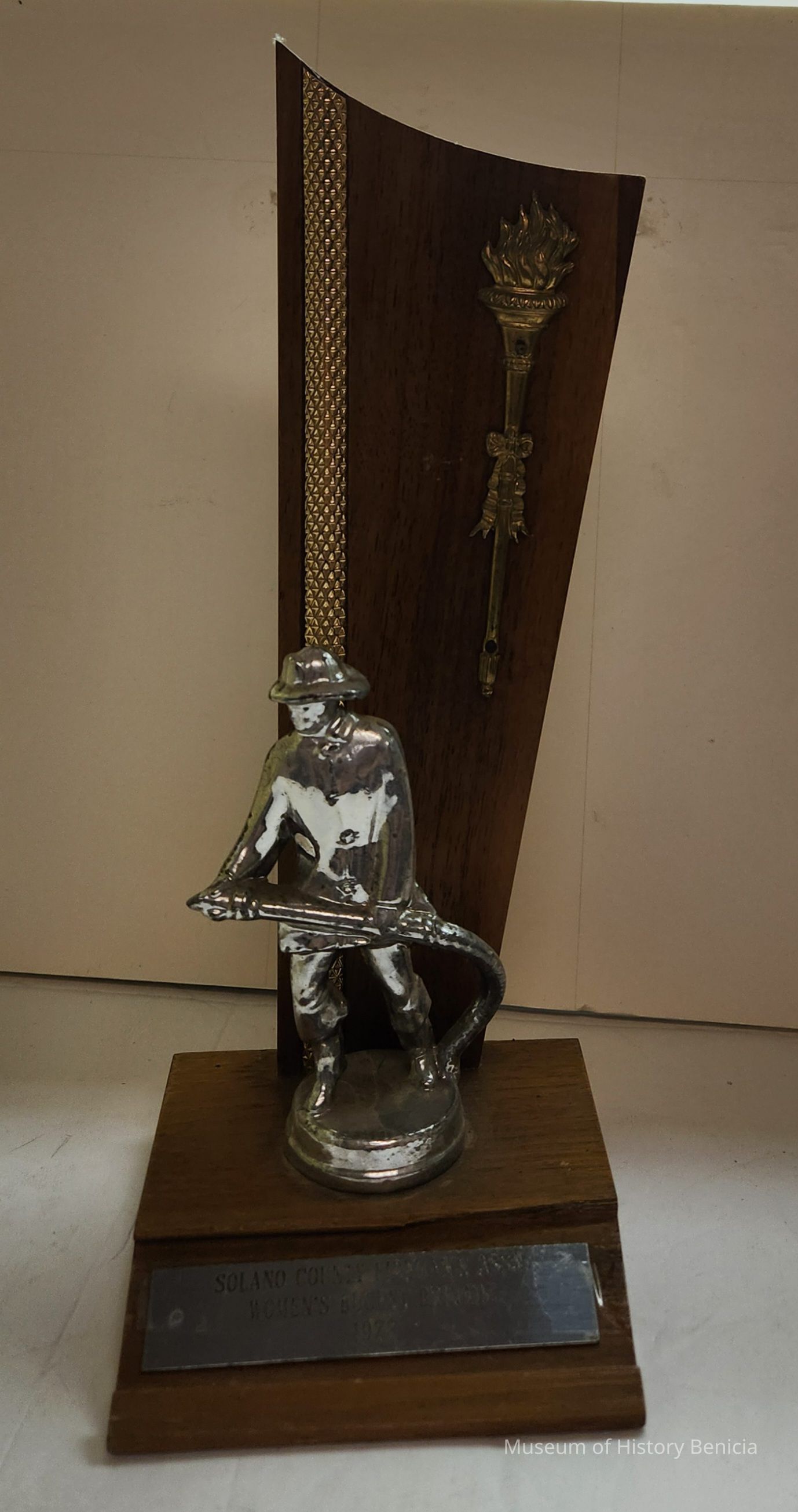 Trophy with wood base and back-drop with gold metal adornment and silver firefighter and plate