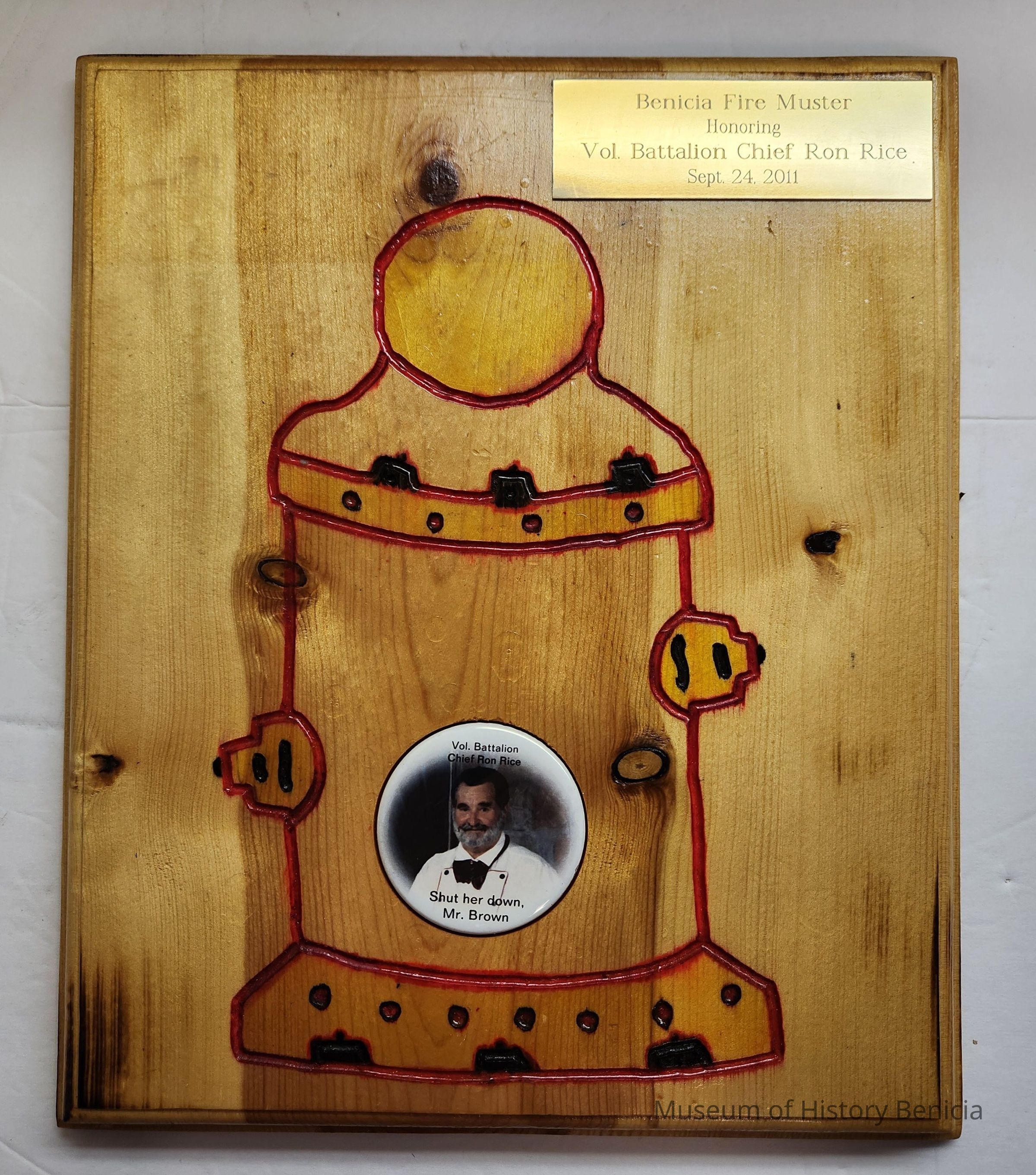 Wooden award with large red fire hydrant etched in the middle. At the top right is a brass plate and in the lower area of the hydrant is a plastic button.