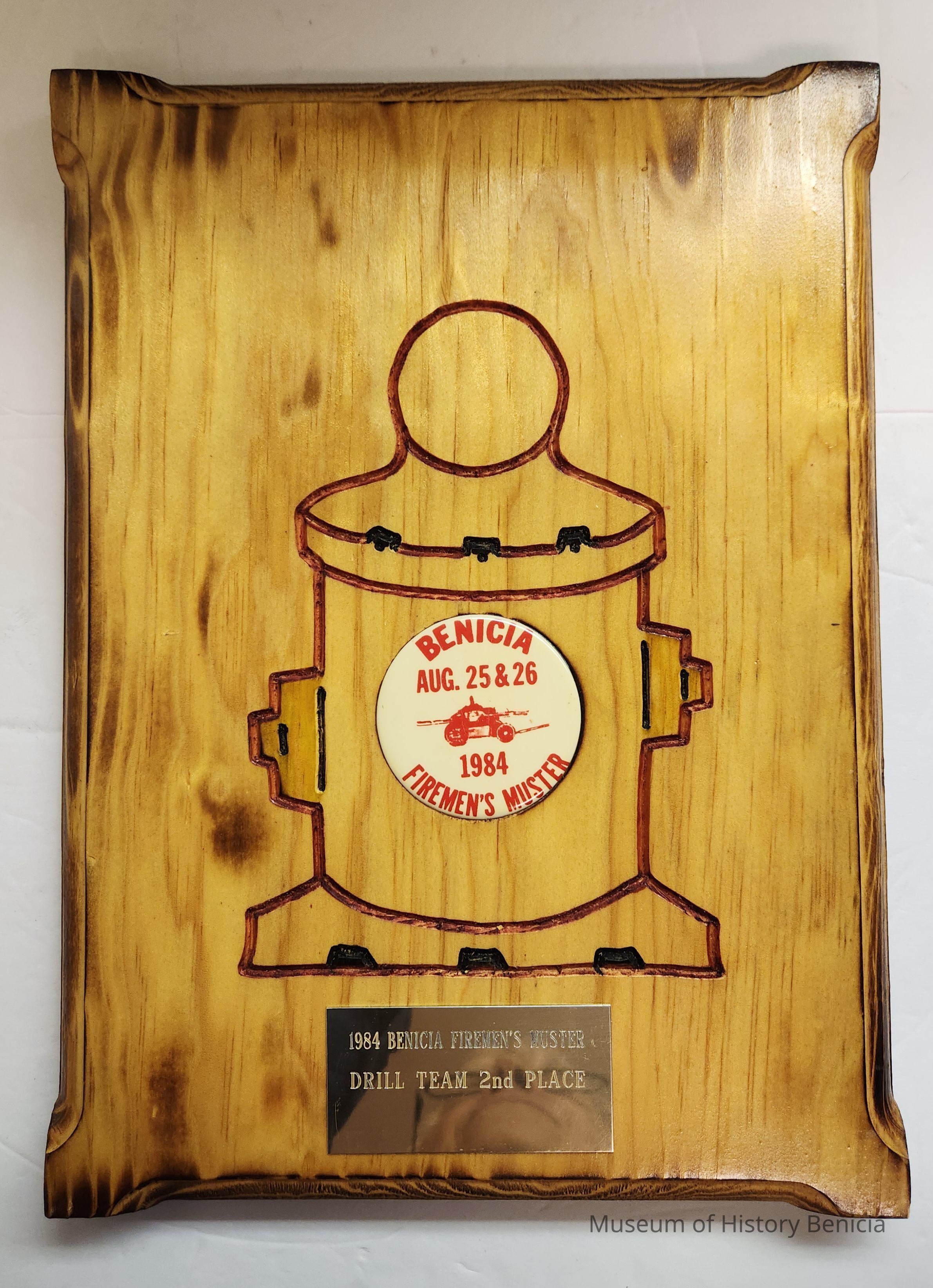 Wooden award with red etched fire hydrant. In the middle of the hydrant is a plastic button and at the bottom is a metal plate.