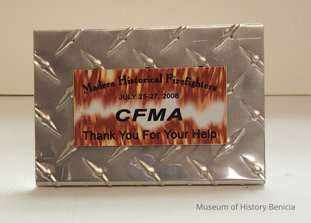 "L" shaped thick metal award with a label on the front - orange and white with black lettering