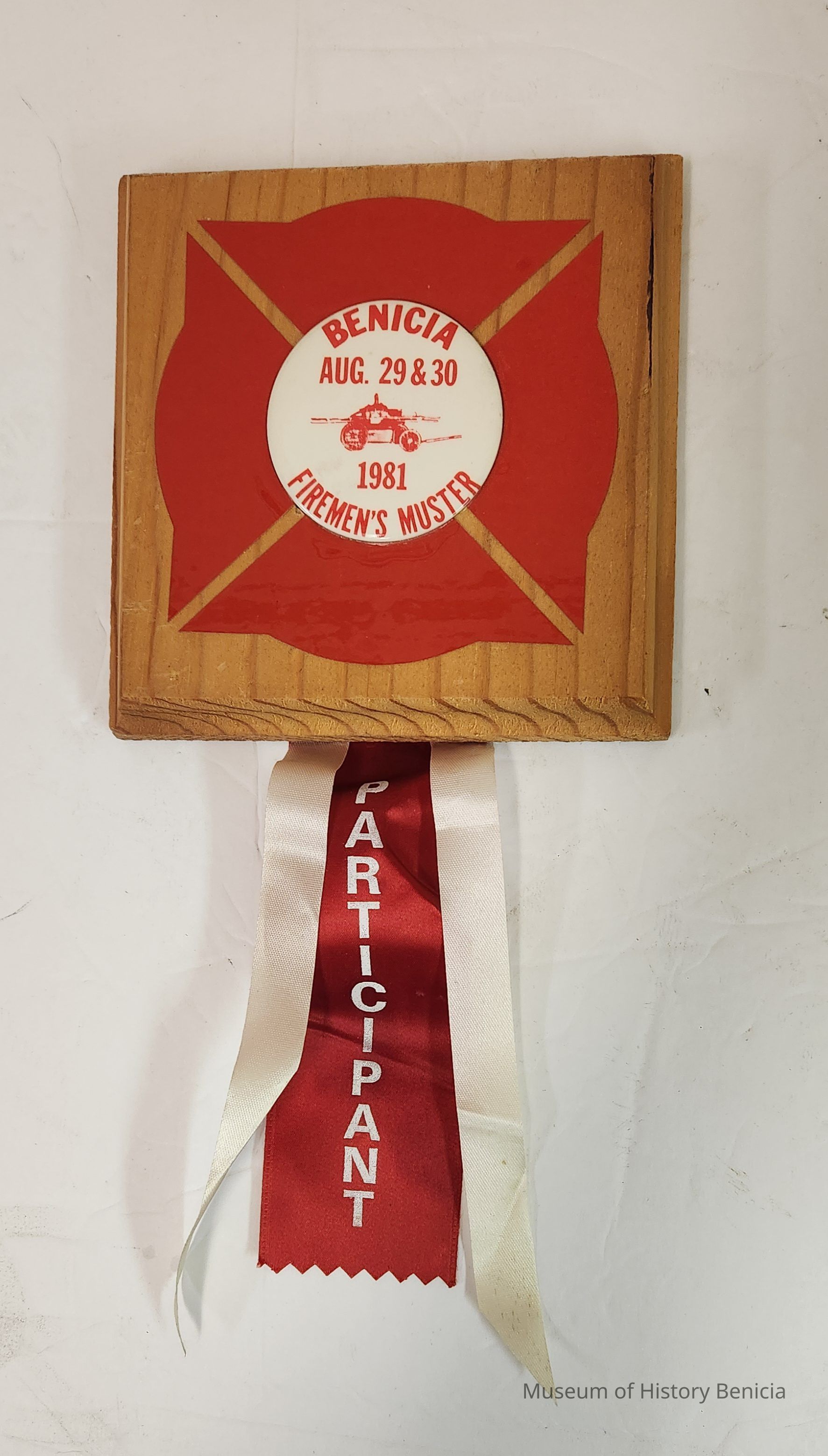 Wood plaque with 2-1/4" diameter badge in the center with red insertions around it.