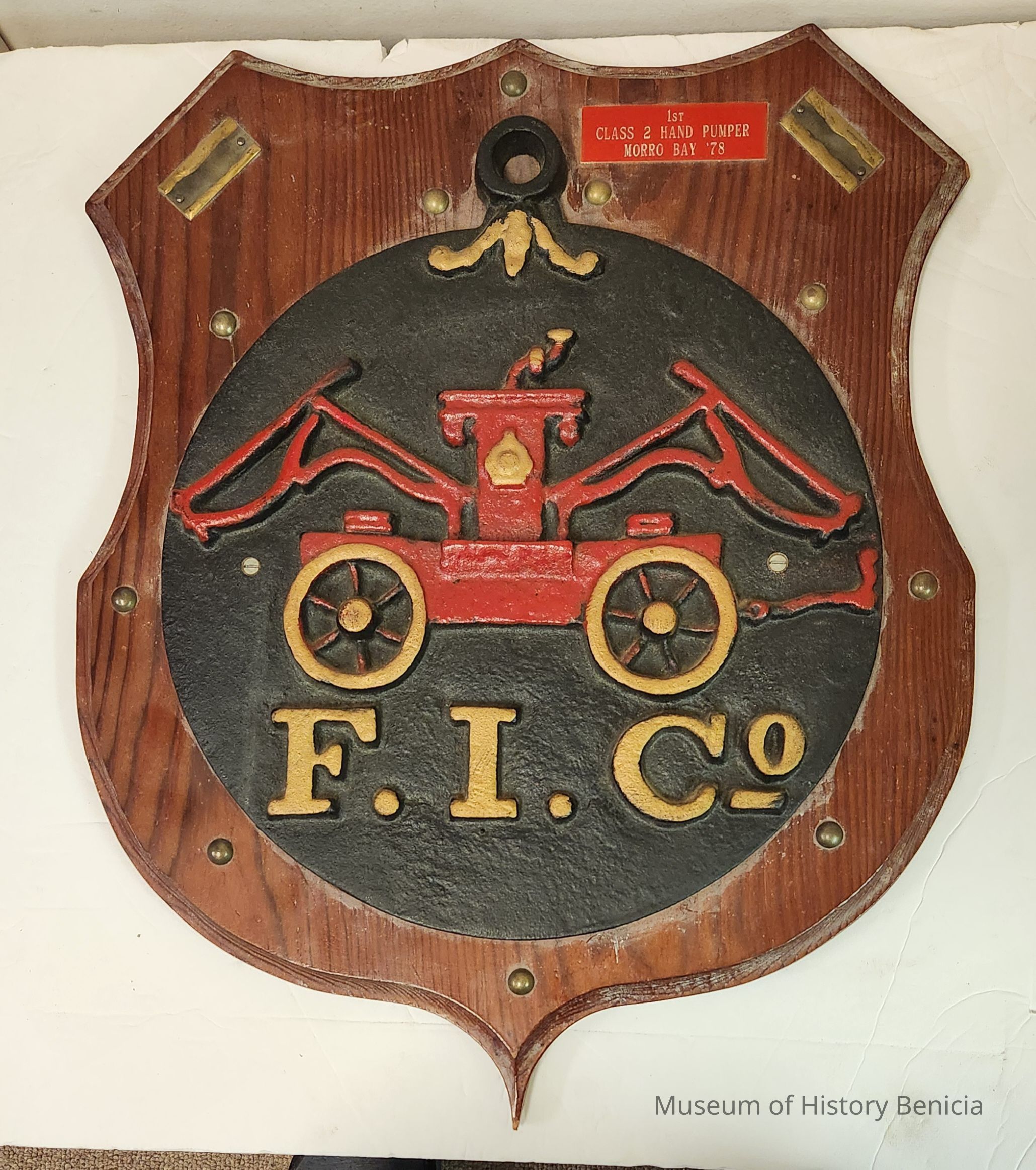 Shield-shaped award: backing is wood with a circular piece of black metal in center, there is a raised image of a hand-pumper in red & gold and the gold letters, F.I.Co on the circle. There are two brass plates at the right and left top and ten brass-look tacks around the circle. There is a red plastic plate near the top right edge. There is a routed ridge around the entire edge.Collection