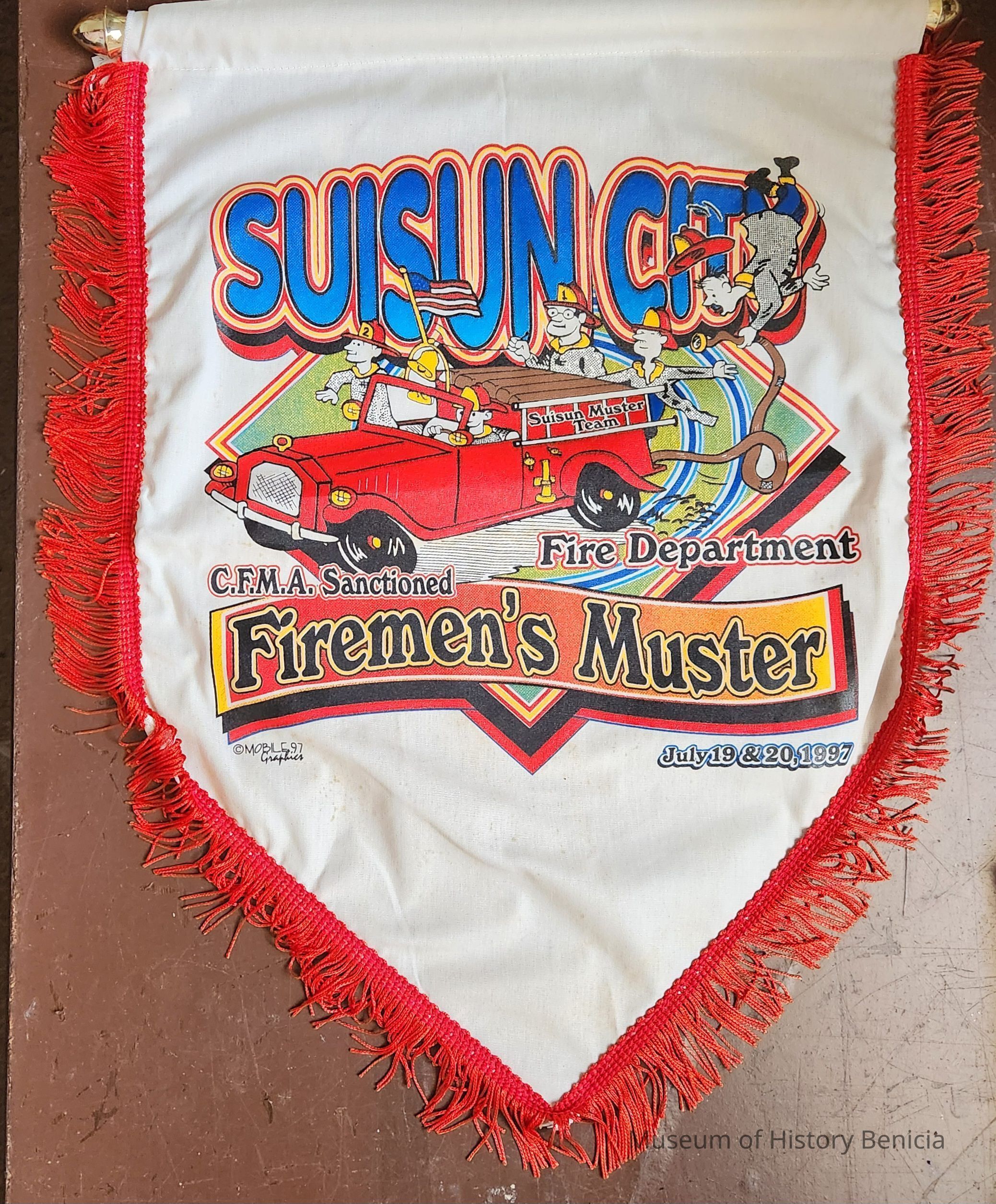 Award banner with fringe on a plastic rod in a top pocket; it is white with red fringe and colorful painted on decal.