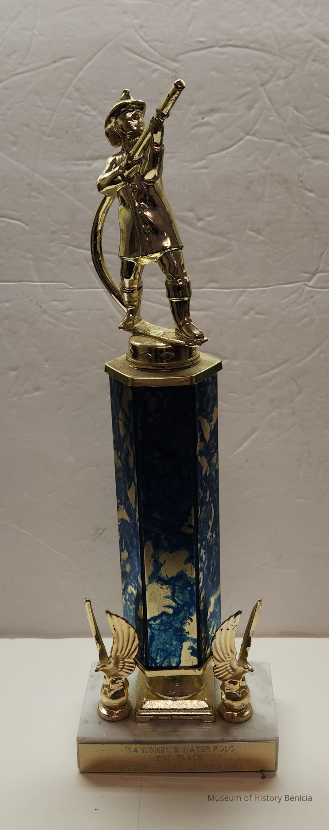 Trophy - marble base with brass plate on front; two eagles (one on each side of the blue marbleized plastic pillar); fireman figure with a hose on top.