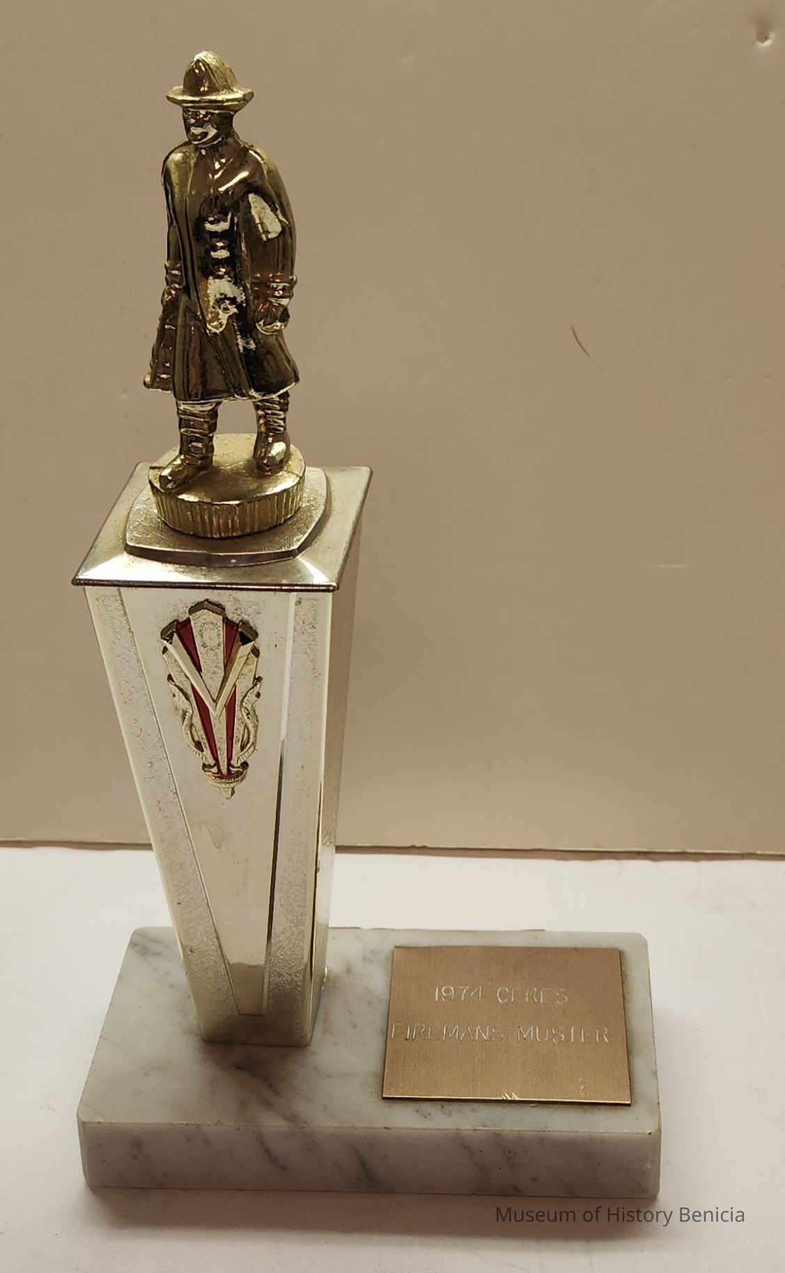 Trophy - metal pillar with a fireman figure on top; marble base; brass plate on base; felt circle on bottom corners.
