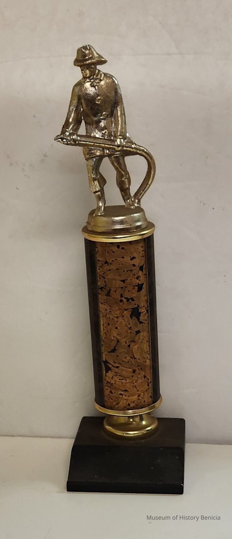 Trophy - wooden base; column: gold metal-brown metal with gold/brown insert-fireman figure with a hose is on top.
