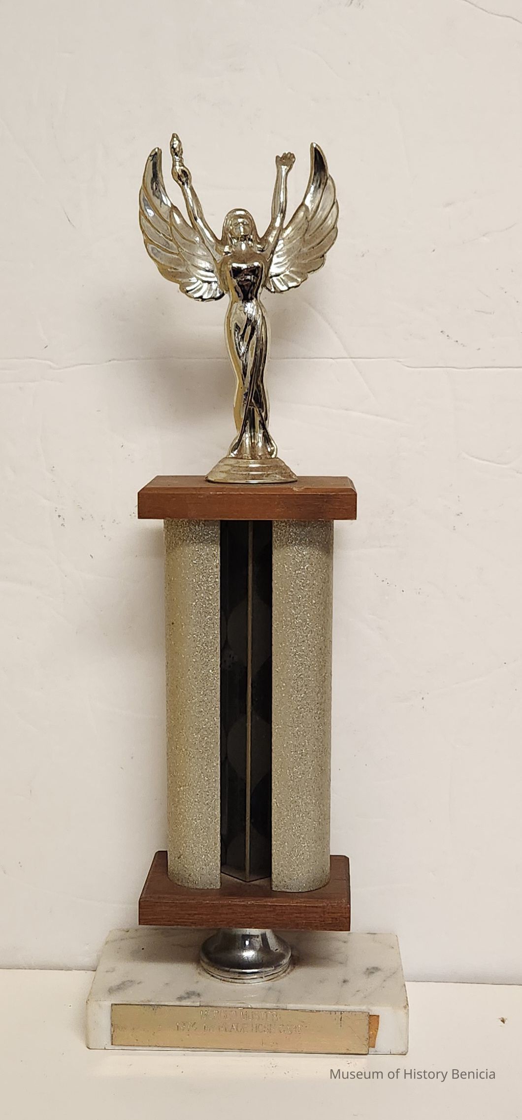 Trophy - marble base with brass plate on front; column is metal-wood-gold plastic with dark metal insert-wood; winged female victory with arms raised is on top.