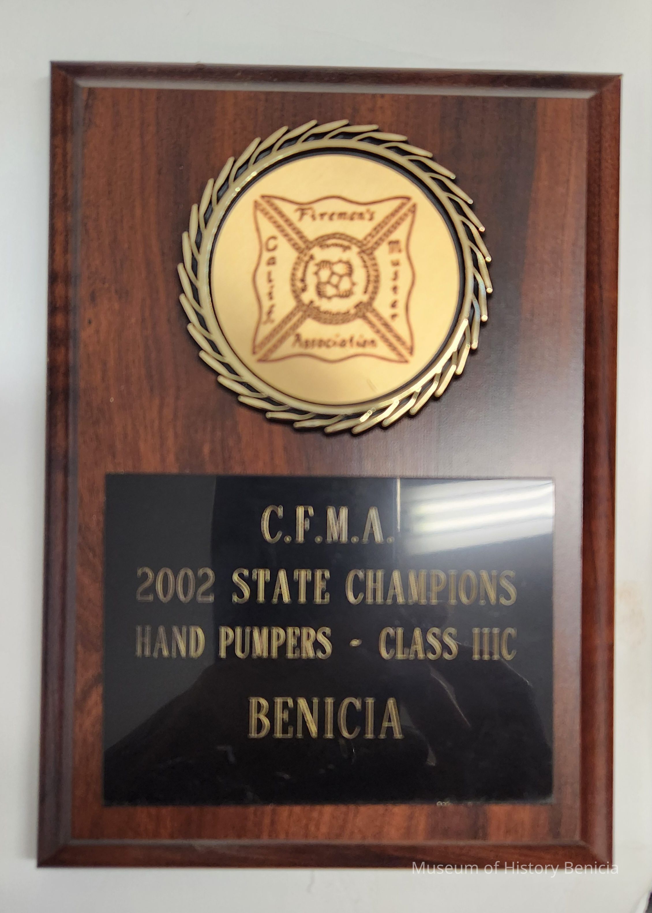 Dark brown wood plaque; gold plastic medallion above a black plate with gold lettering; beveled edges.