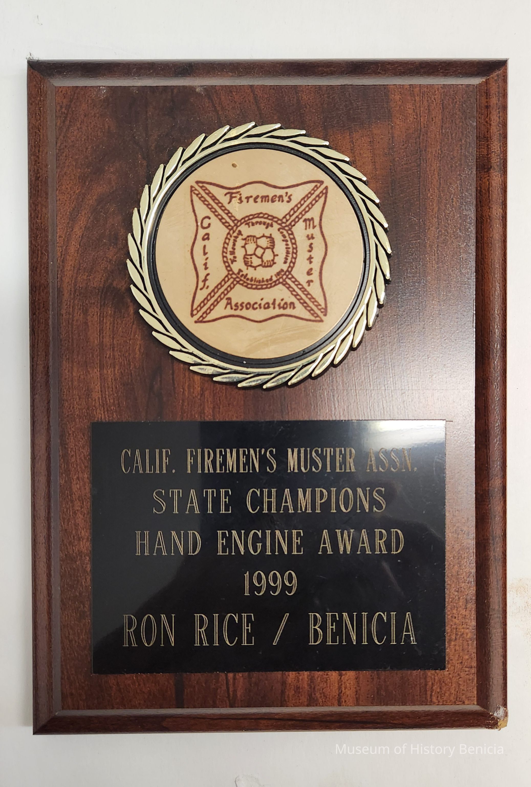 Dark brown wood plaque; gold plastic medallion above a black plate with gold lettering; beveled edges