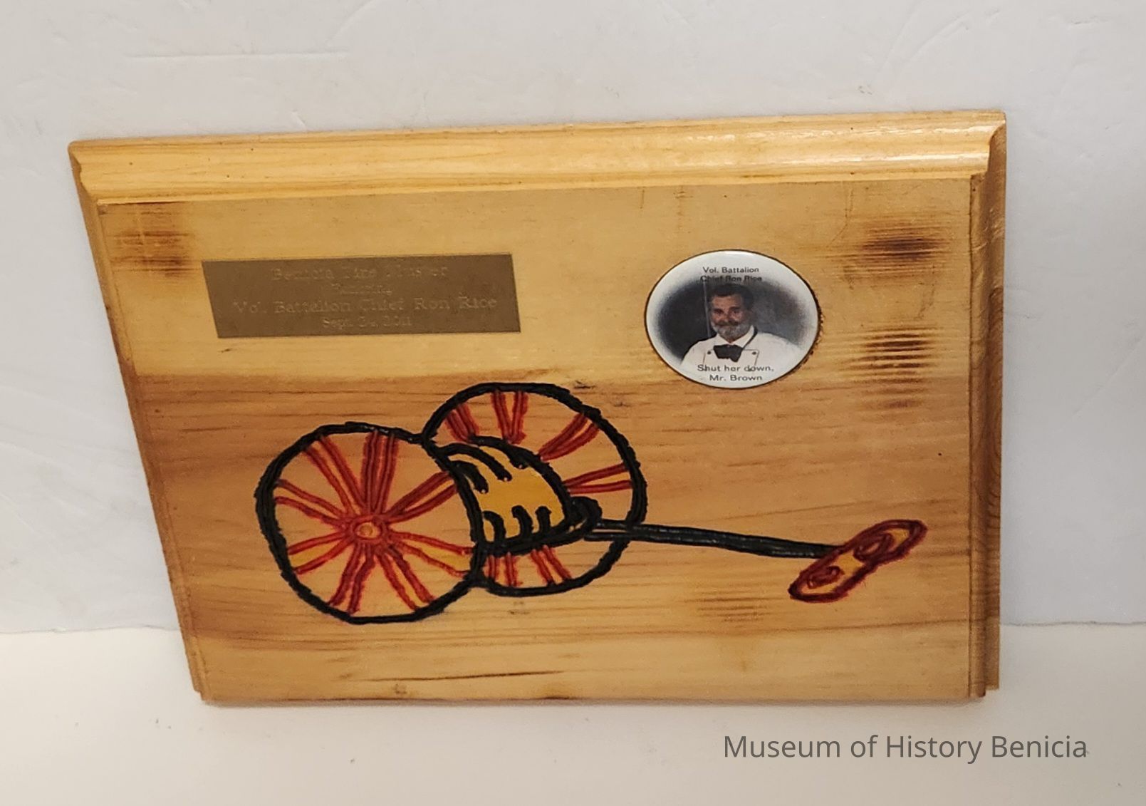 Wooden plaque with outline of a hose cart etched in (colors red & black); rectangular brass plate in upper left and round button in upper right