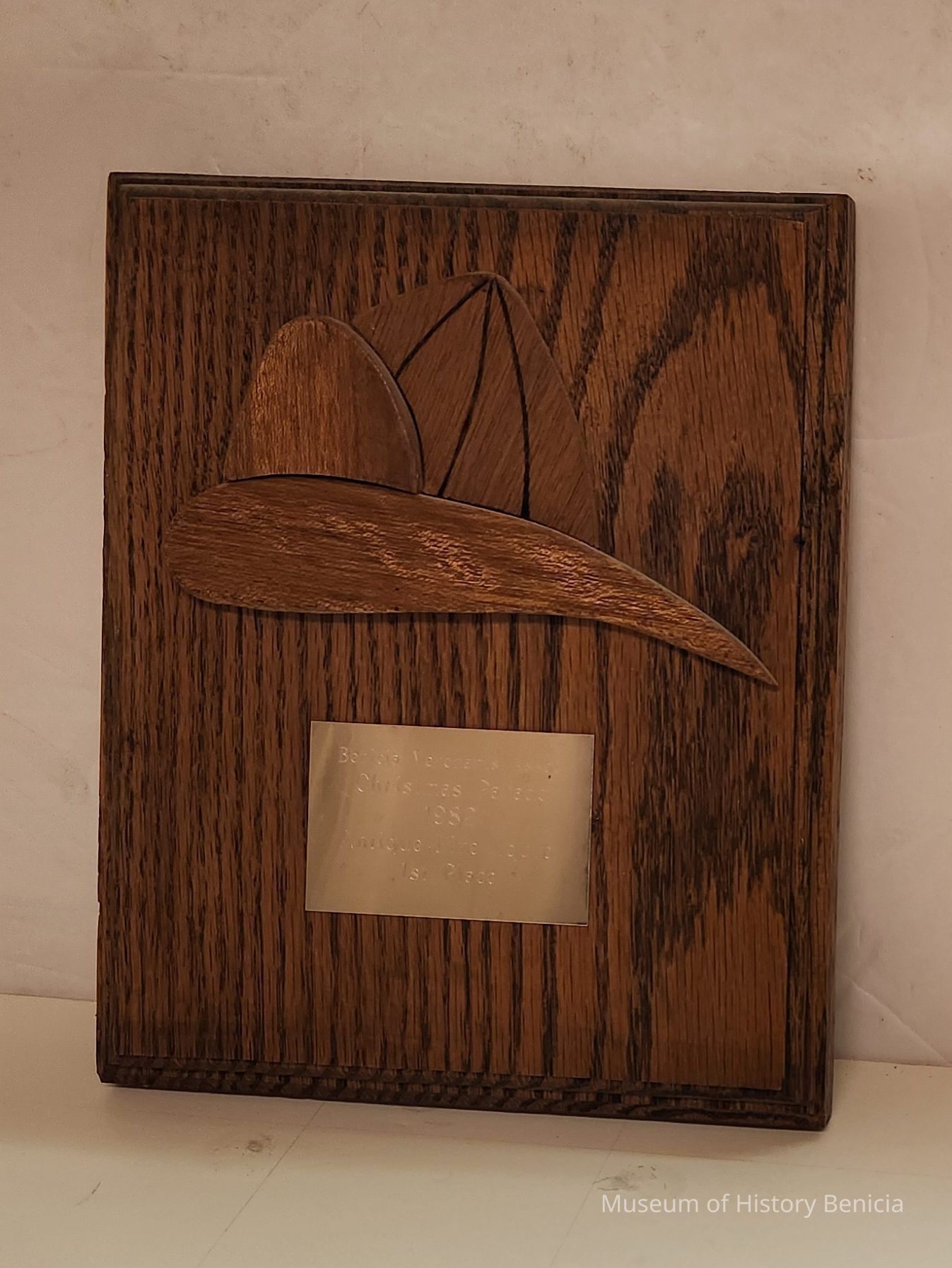 Wooden plaque with a raised wood depiction of a fireman's helmet; has a brass plate and the edges are tiered.
