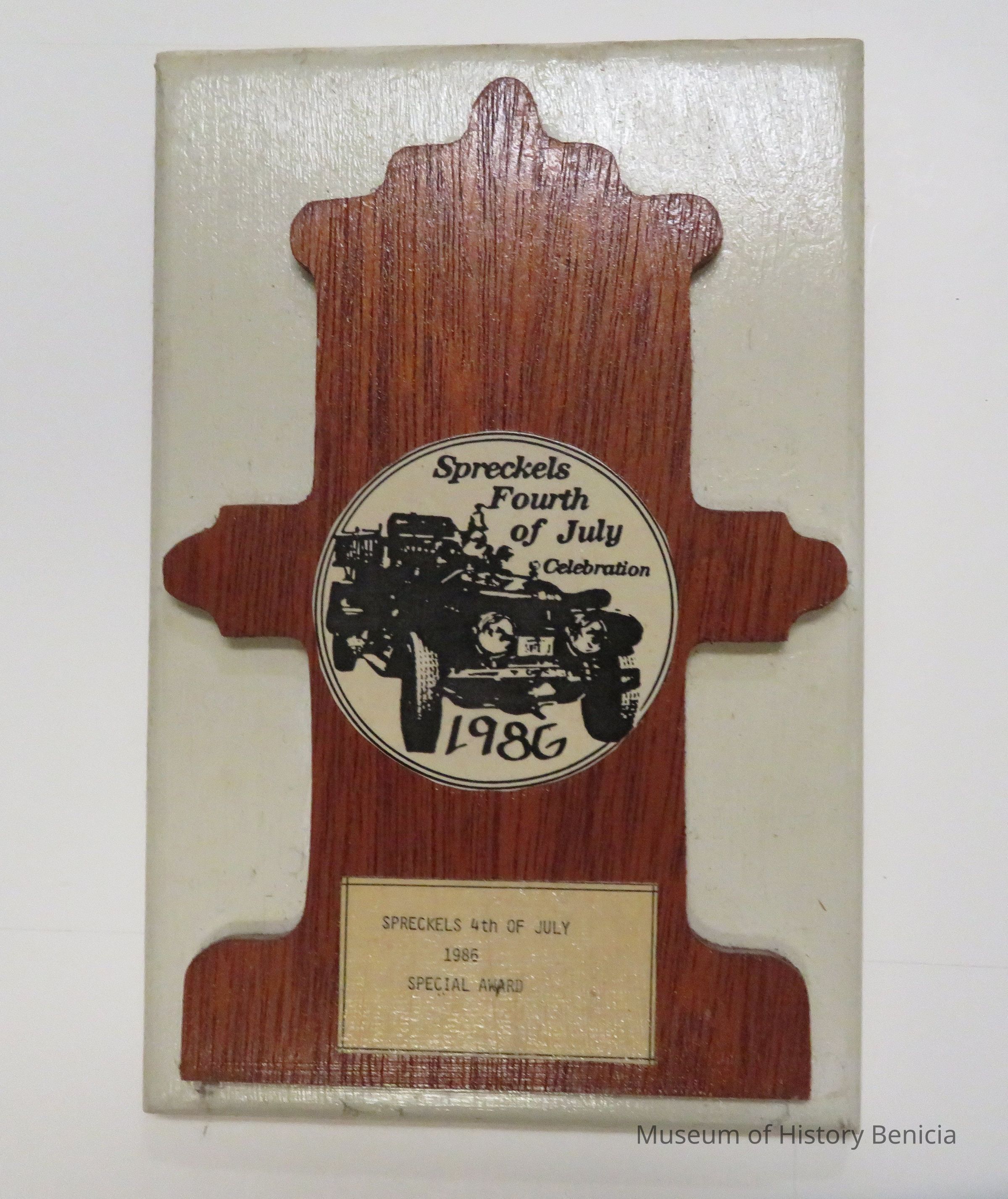 Wood plaque painted a cream color. Mounted on it is a stained wood fire hydrant. A round sticker is glued in the middle of the hydrant with a picture of a fire truck and the words "Spreckles Fourth of July Celebration 1986."Collection