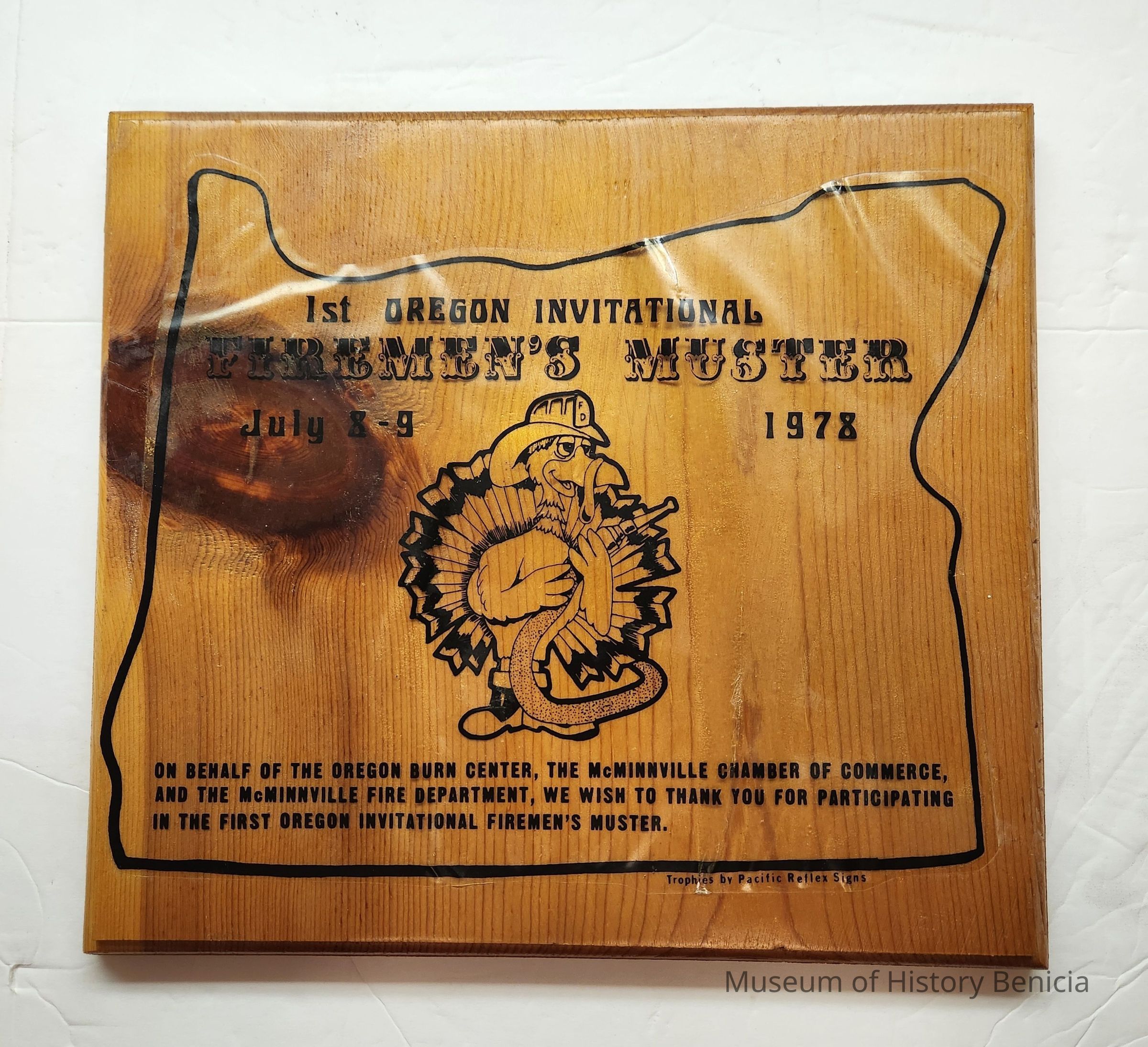 Wooden plaque with black on clear decal.