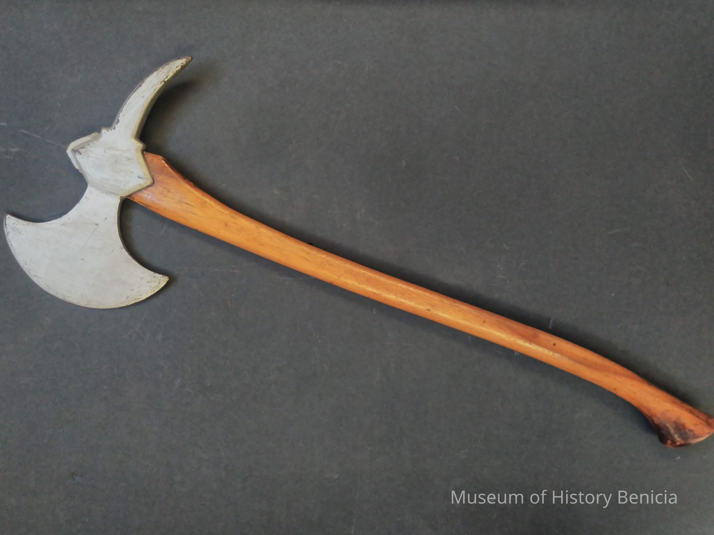 Late 19th cent fire ax - silver painted ax head with bare wood handle