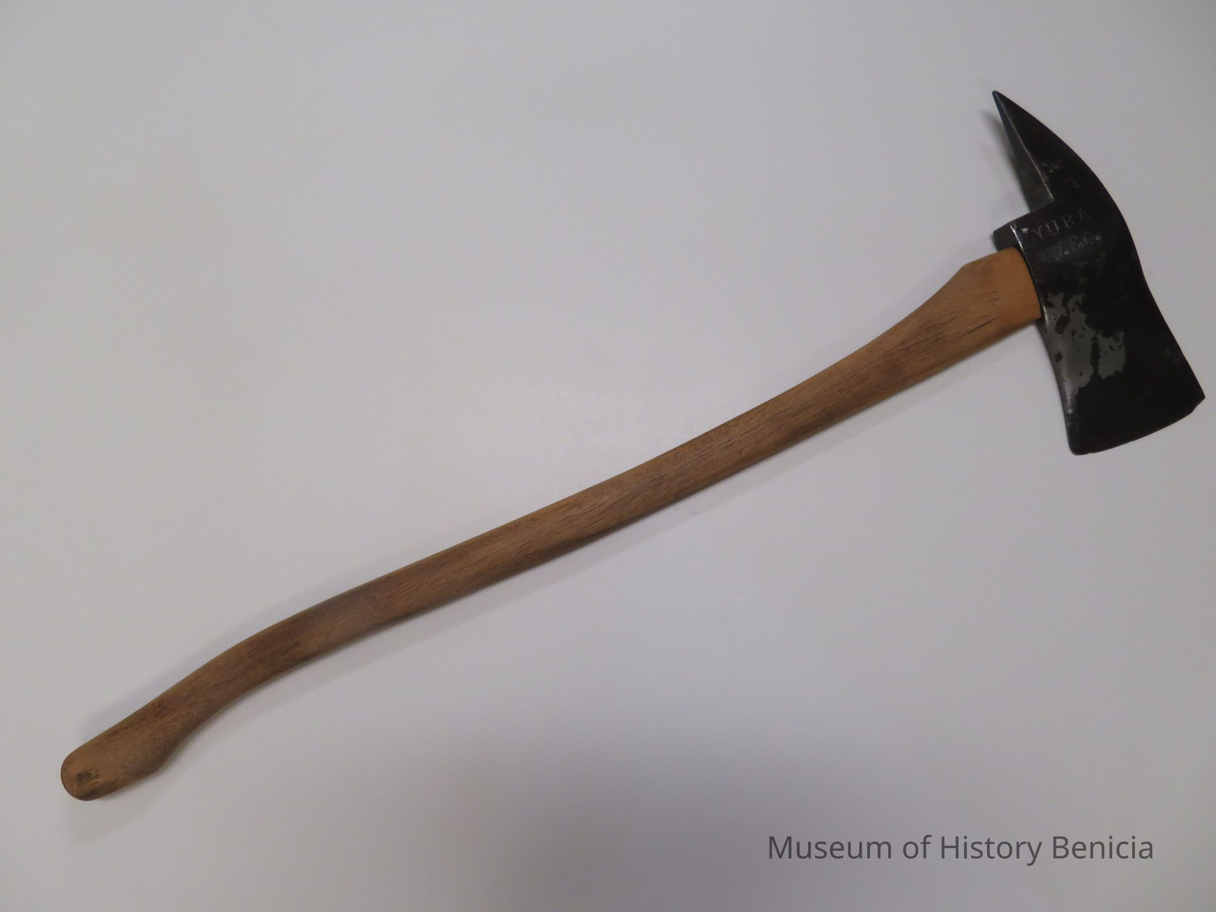 Wood handle ax, blade is 12" x 4 5/8". Handle is 36" in length. Inscribed on blade is YUBA V.F.D.