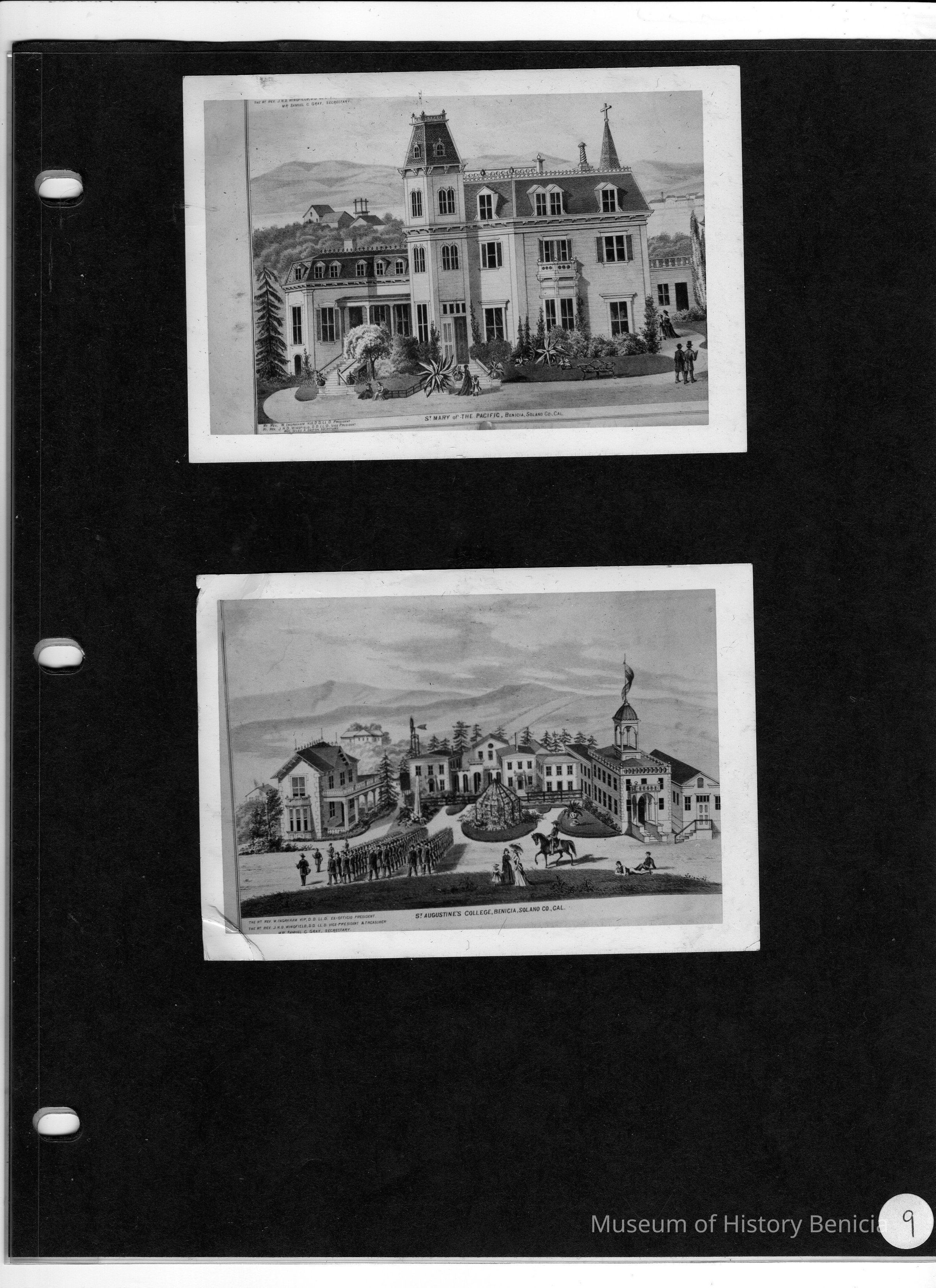 Page contains 2 B/W photos, both taken from old illustrations (lithographs?). Top shows St. Mary's of the Pacific; bottom shows St. Augustine's College.Collection