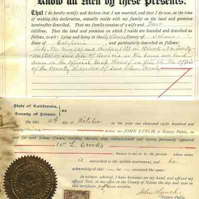 dated October 11, 1899, filed by W.L. Crooks for recording on November 6, 1899 at 9:56 am in Volume 9 of Homesteads page 11 Solano County Office of Records.