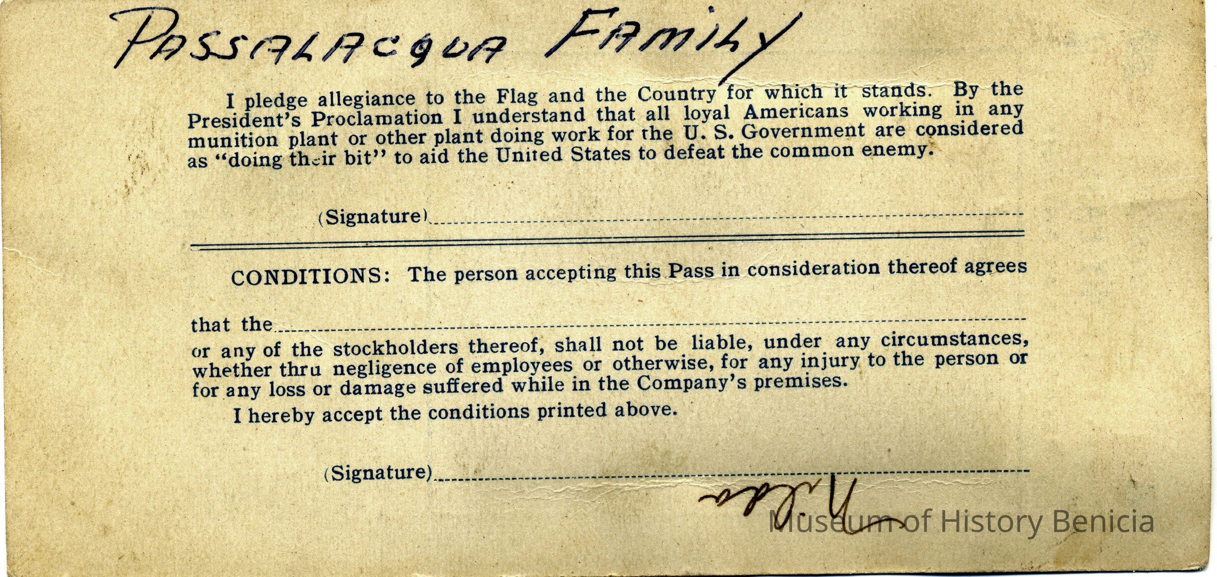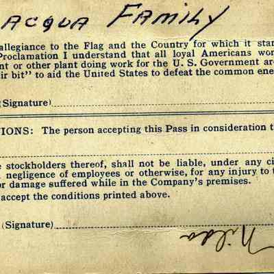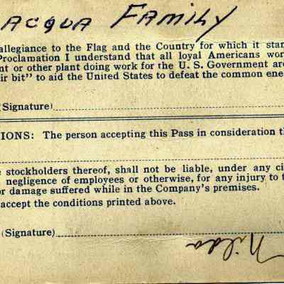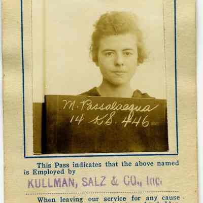 This is an employee badge for the Kullman, Salz & Co leather plant. It shows the photo of the employee, M. Passalacqua. Written on the back is "Nilda". I assume the badge belongs to Melba Passalacqua but she did have a sister named "Nilda". It is authorized by M.K. Salz.