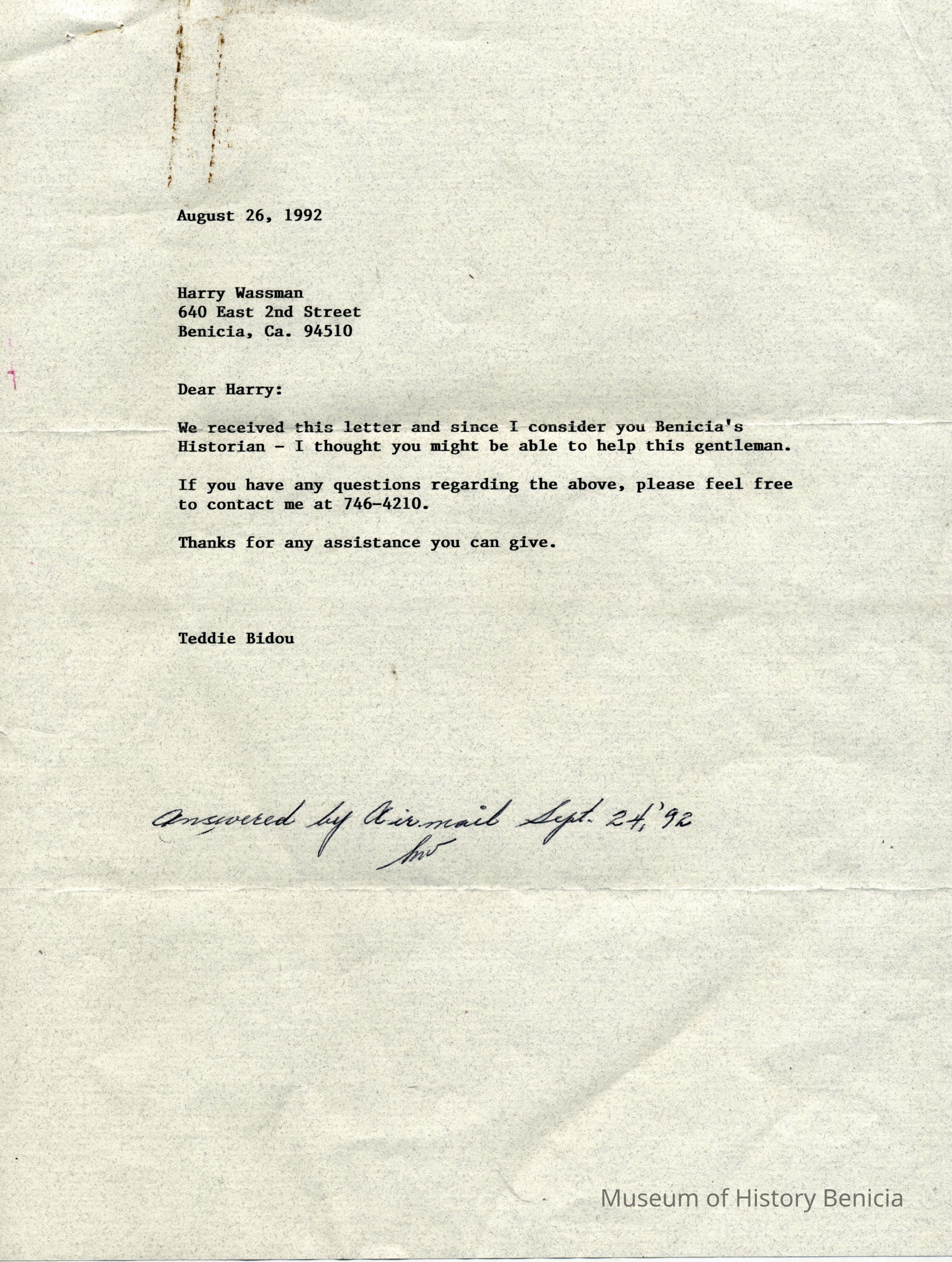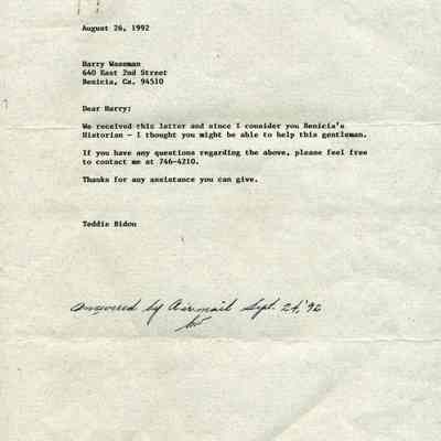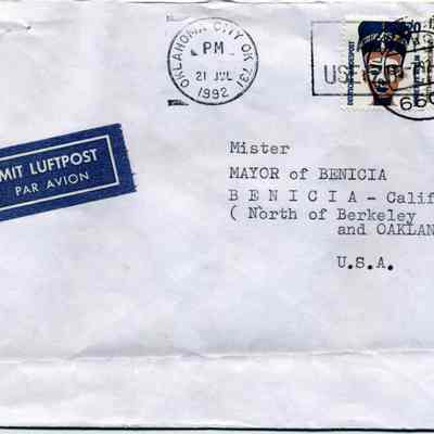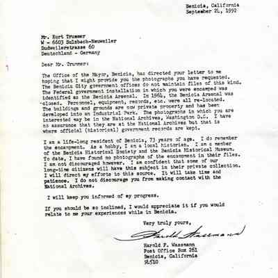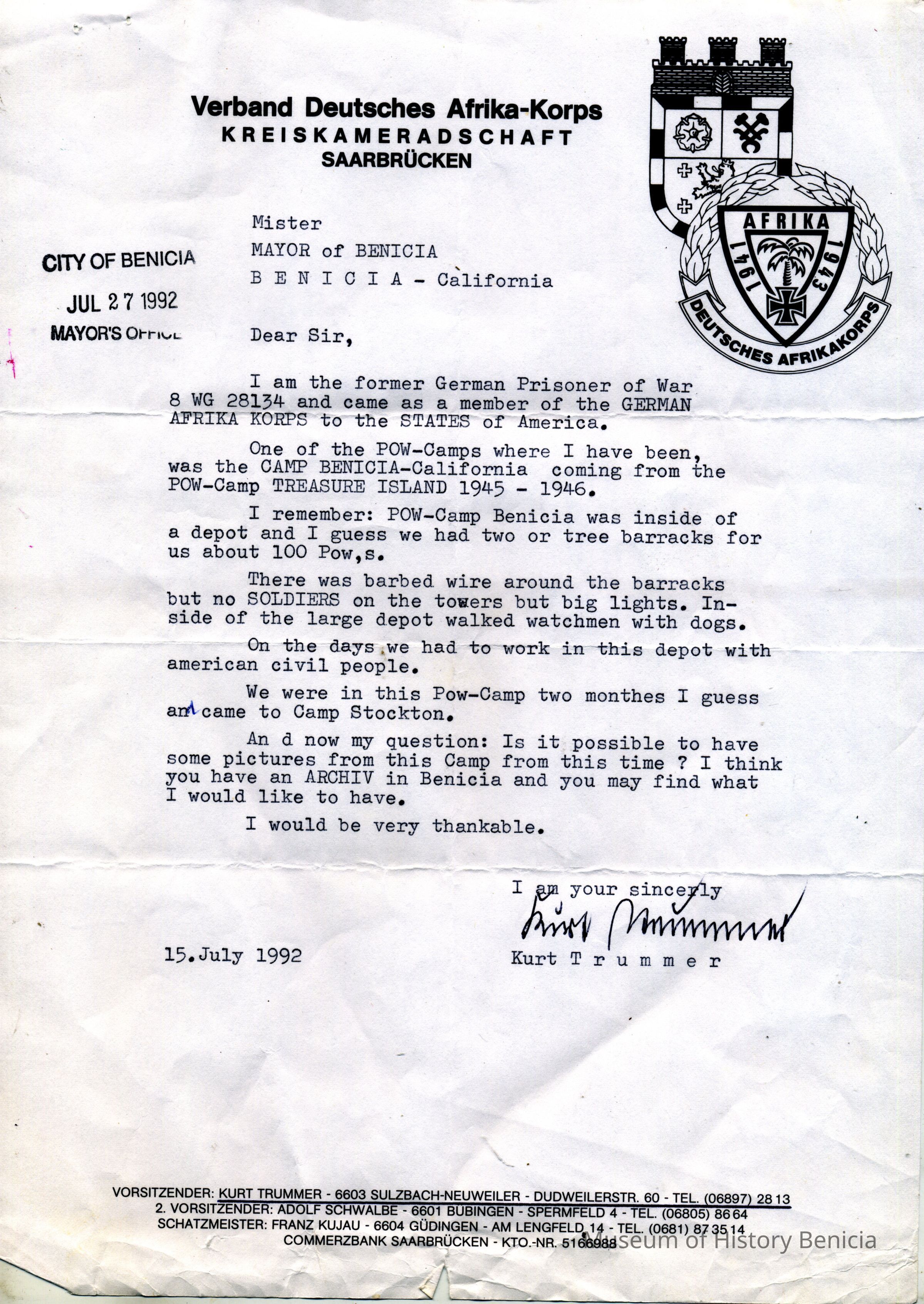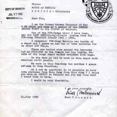 This is an exchange of letters between a German Prisoner of War (POW) and people in Benicia. The POW was writing to the Mayor of Benicia asking for photographs of the prison where he stayed for two months during WWII. His name is Kurt Trummer. He was in the German Africa Corps (Afrika-Korps). The stationary he used has markings from that unit. The mayor asked Harry Wassmann to answer the man.