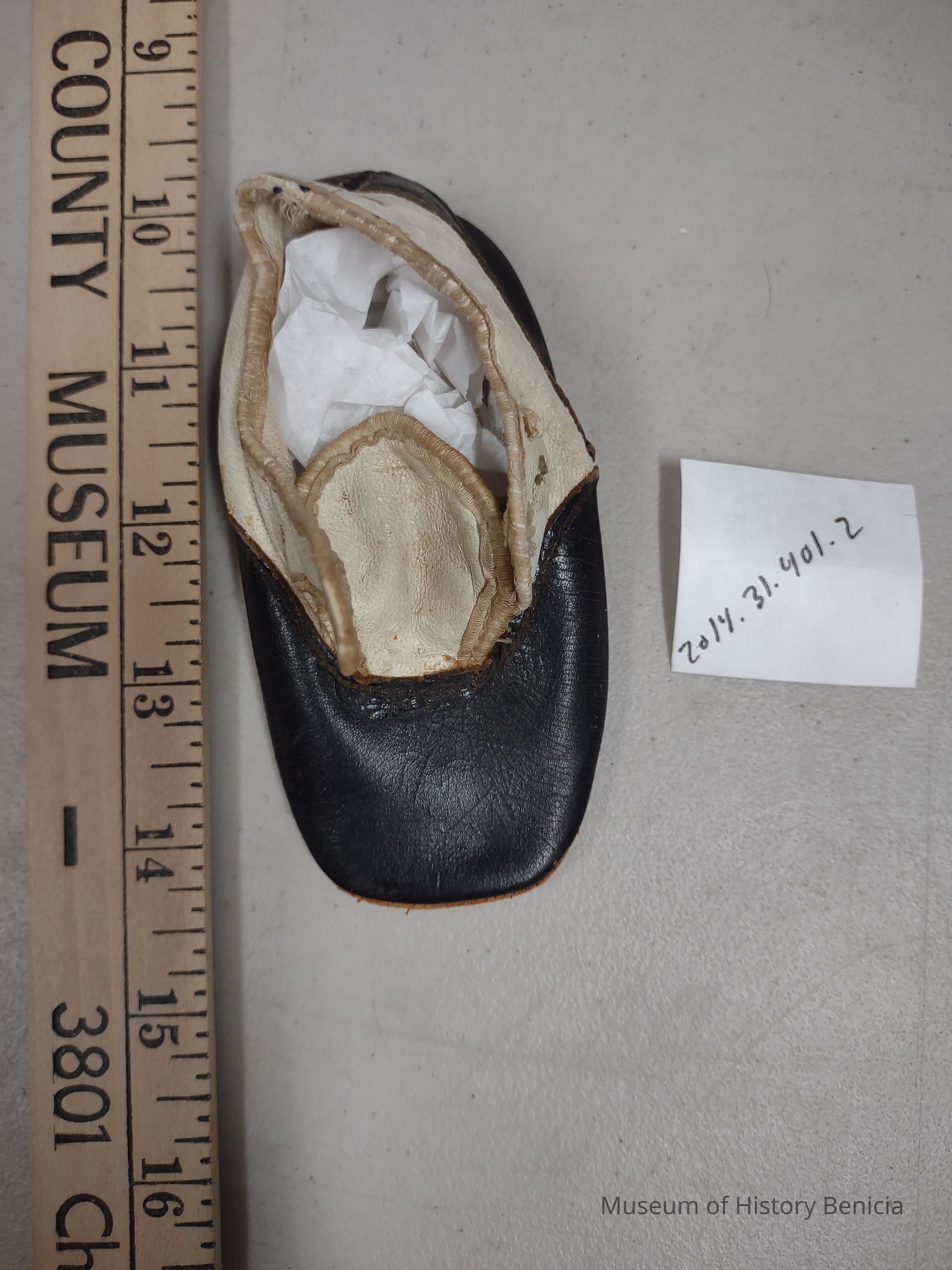 Single baby shoe (left foot?). Mary Jane style. Leather. Black and white colors. Measures 4" in length, 2" wide. Button is missing on strap. Donated by McKay family. Could possibly be the twin of 2014.031.401.1 ( bronzed).
