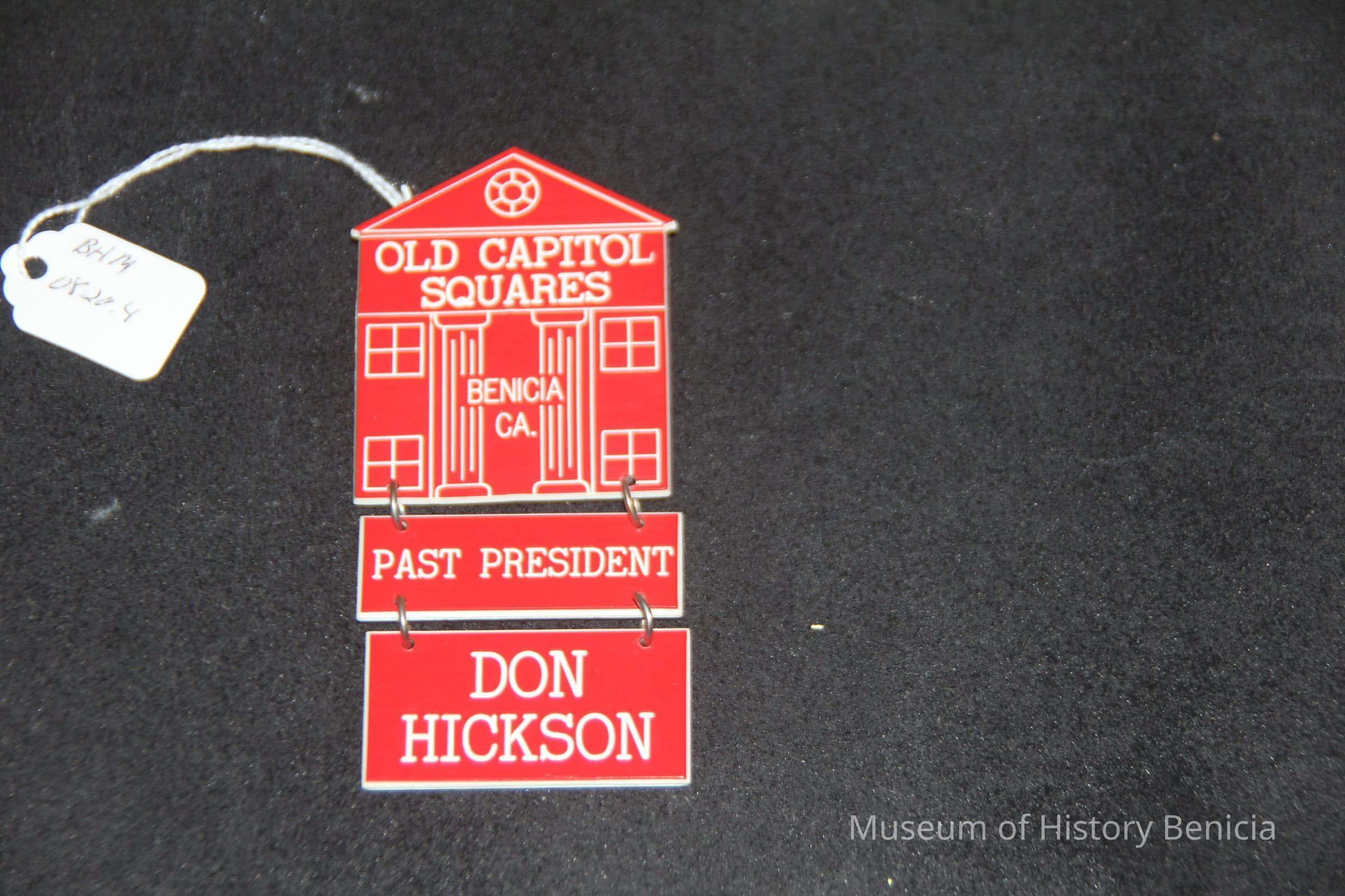 Red and white Old Capitol Squares Badge that reads "Past President Don Hickson"