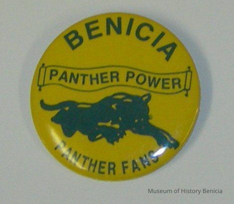 round "spirit" badge, blue lettering on yellow gold background, "Benicia" at top, banner "Panther Power", in center crouching panther, at bottom "Panther Fans", locking pin back