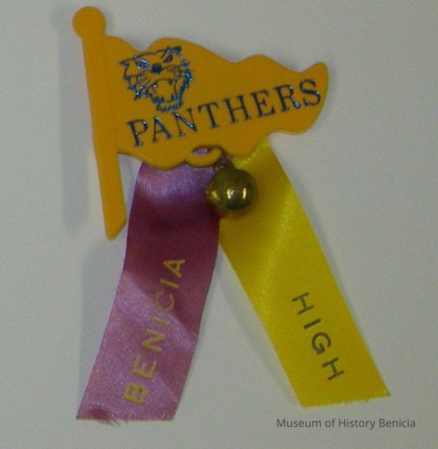 plastic pennant on pole shaped pin with blue panther head and "Panthers" on yellow background, gold basketball charm hangs from pennant, two streamers at bottom blue (faded to purplish hue) with "Benicia" in yellow lettering and yellow with "High" in blue lettering