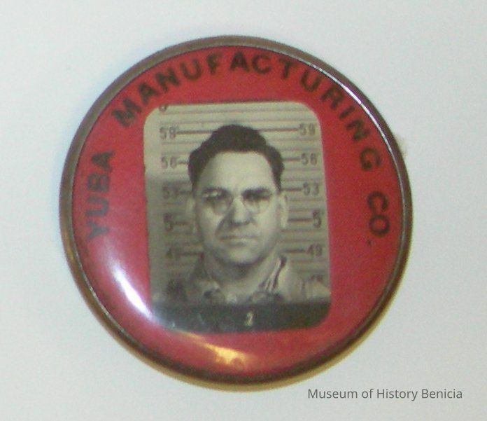 round identification badge, red background, B/W photo in center "Yuba Manufacturing Co." pin on, date unknown appears to be Daniel Barrett