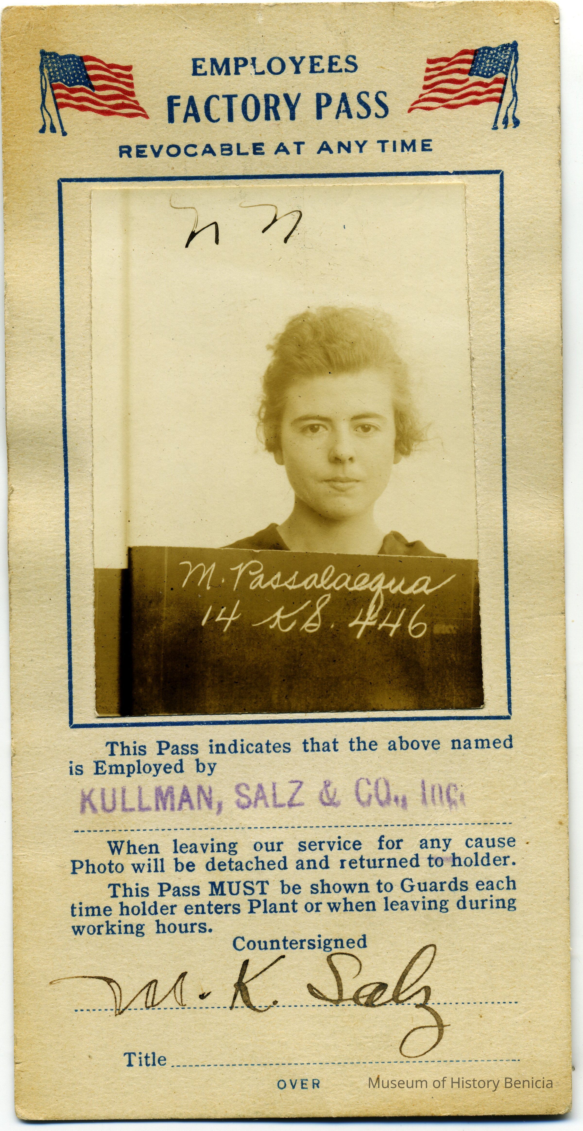 This is an employee badge for the Kullman, Salz & Co leather plant. It shows the photo of the employee, M. Passalacqua. Written on the back is "Nilda". I assume the badge belongs to Melba Passalacqua but she did have a sister named "Nilda". It is authorized by M.K. Salz. The back has a statement about "doing their bit" to defeat the common enemy. Not sure which war they are talking about.