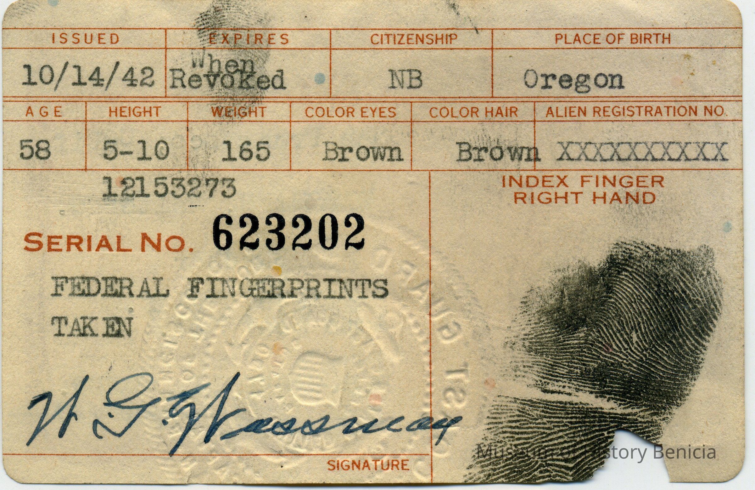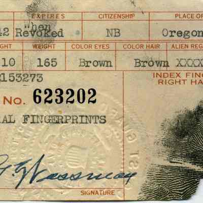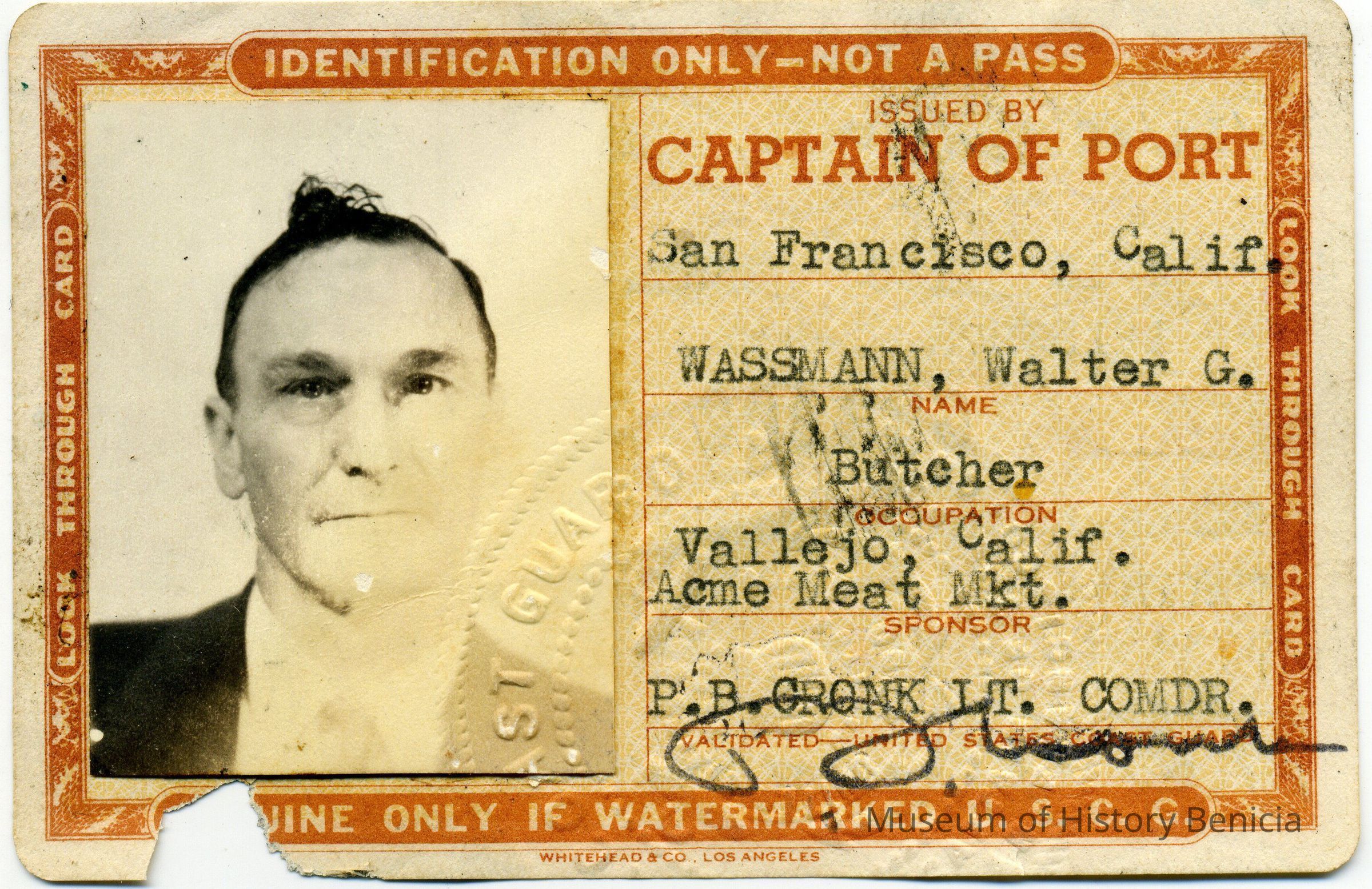 This is the identification badge for Walter Wassmann to enter the Port of San Francisco, CA. It was issued on 10/14/1942 and has a physical description, photo, and fingerprint. Mr. Wassmann was a butcher.Collection