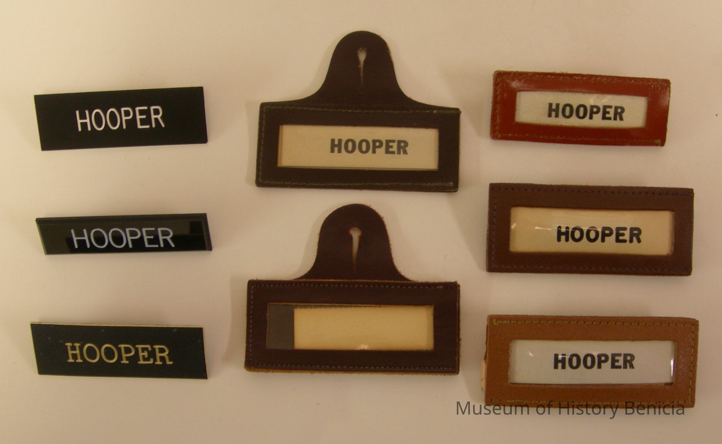 three - leather - Name "Hooper" in black on white paper behind plastic, clutch backsCollection
