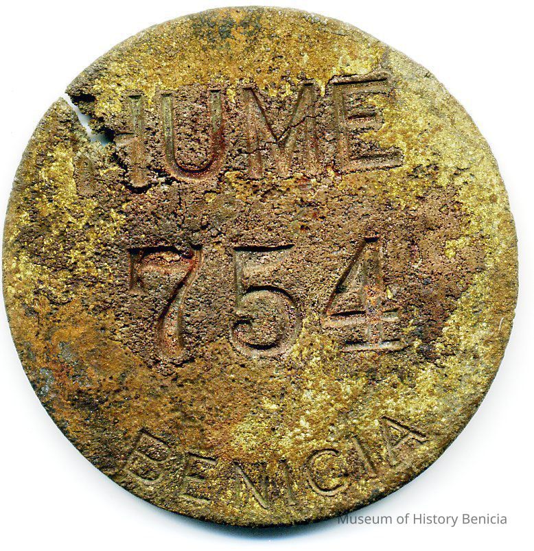 This is a badge from the Hume Cannery in Benicia. It says "Hume" and the number 754 and Benicia on the front. It is 1.25" diameter.