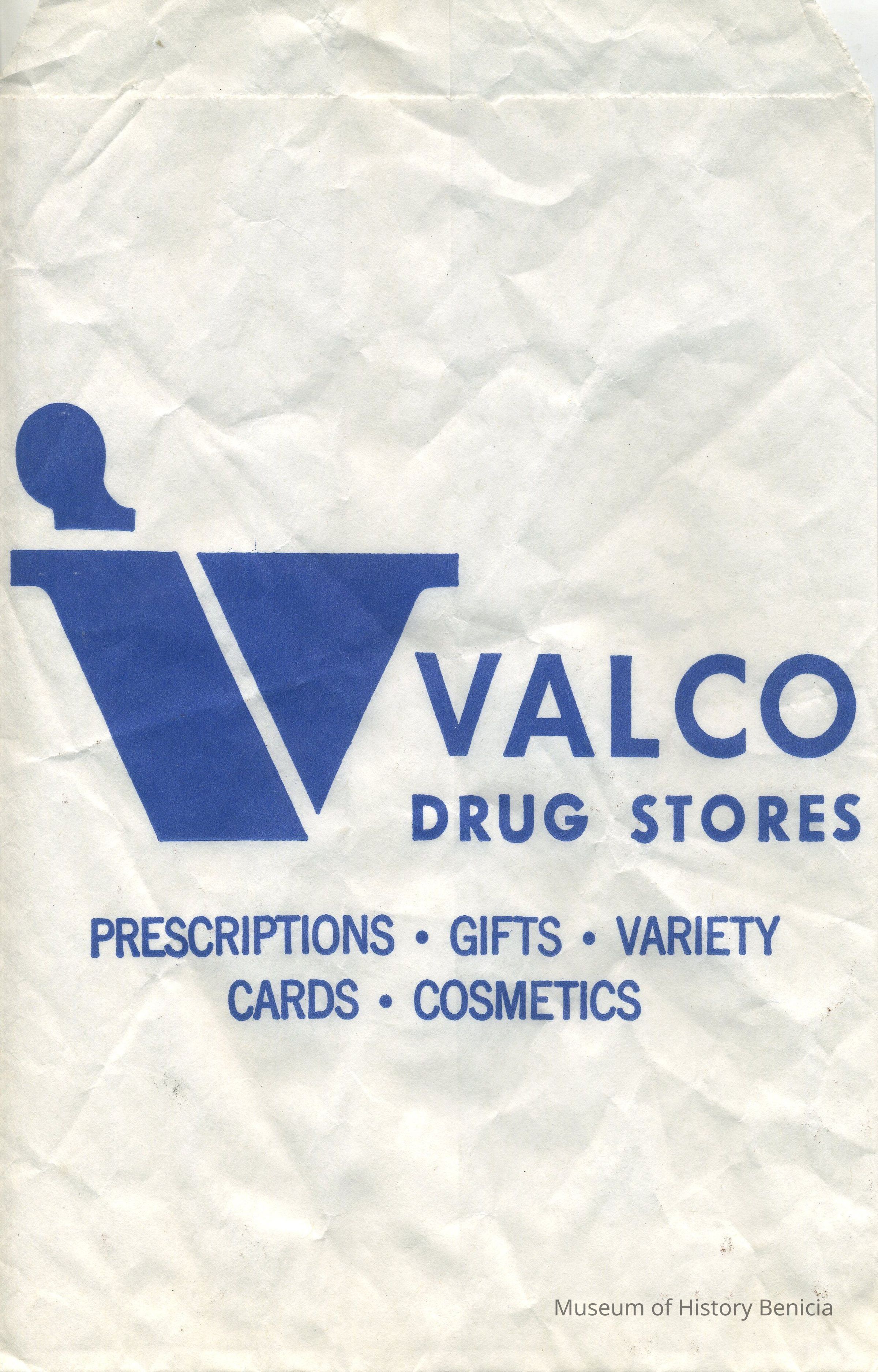 Store Bag - advertising - "Valco Drug Stores / Prescriptions - Gifts - Variety / Cards - Cosmetics"; Blue lettering on white paper bag - printed on one side only; 6-1/4" x 9-3/4"