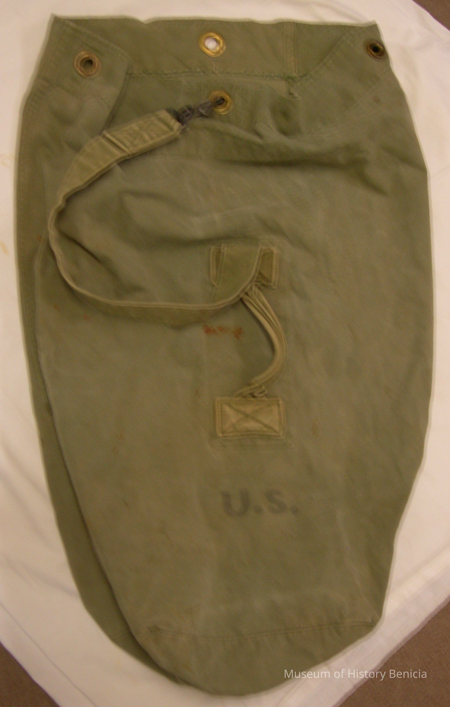 with handle and shoulder strap; four grommets and metal ring on top where shoulder strap attaches to close the bag;