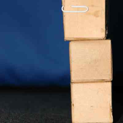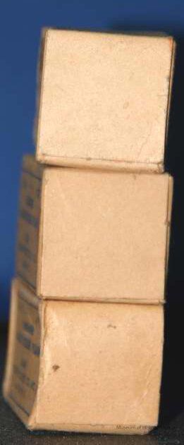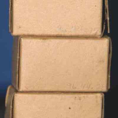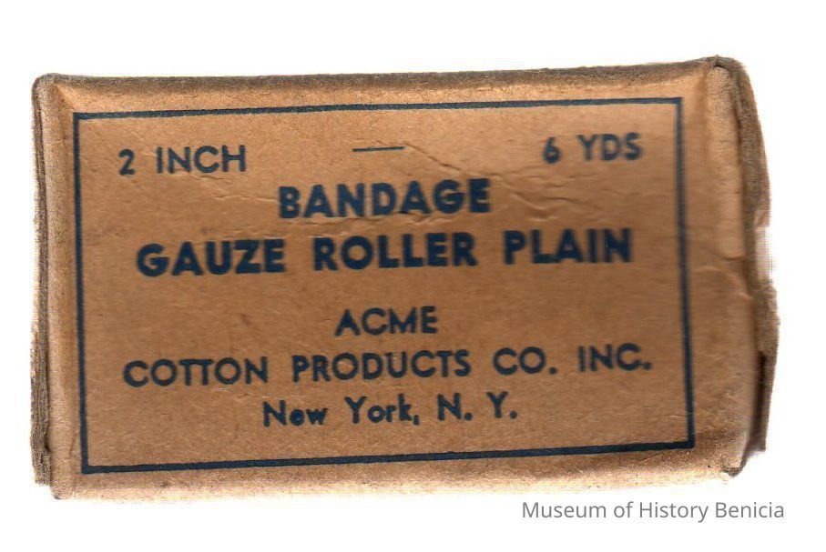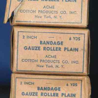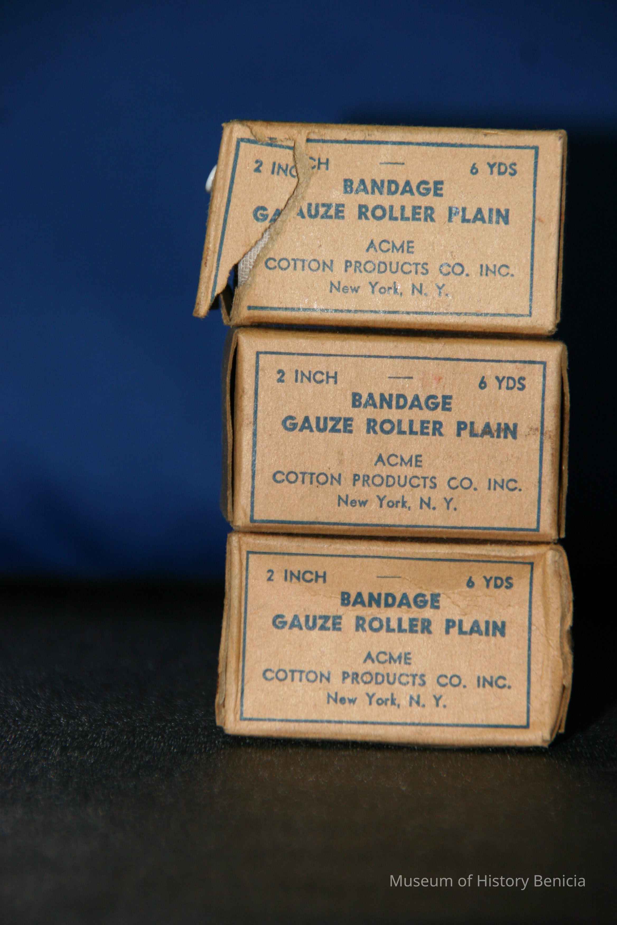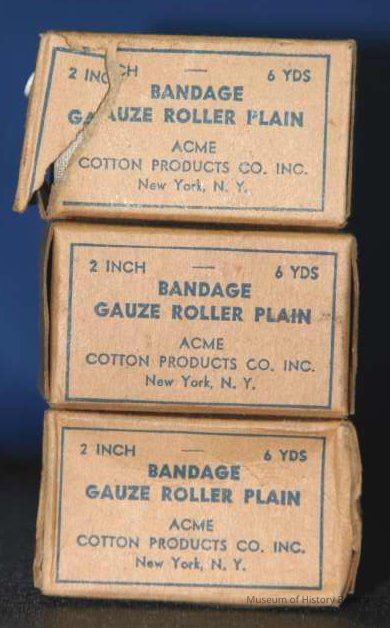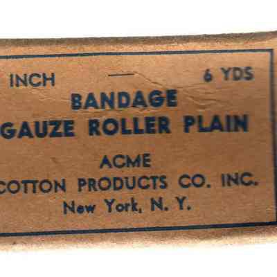 gauze bandage in cardboard box; plain brown background w/blue printing (unopened)