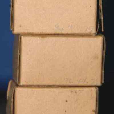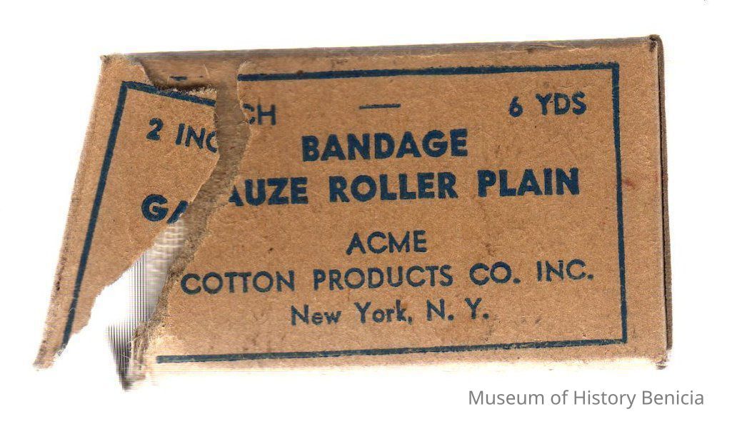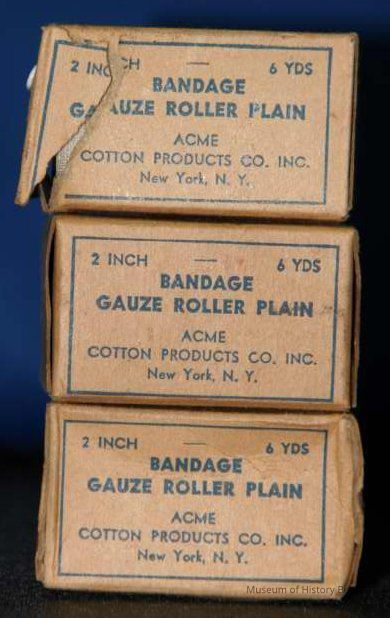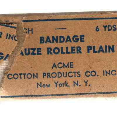 gauze bandage in cardboard box; plain brown background w/blue printing