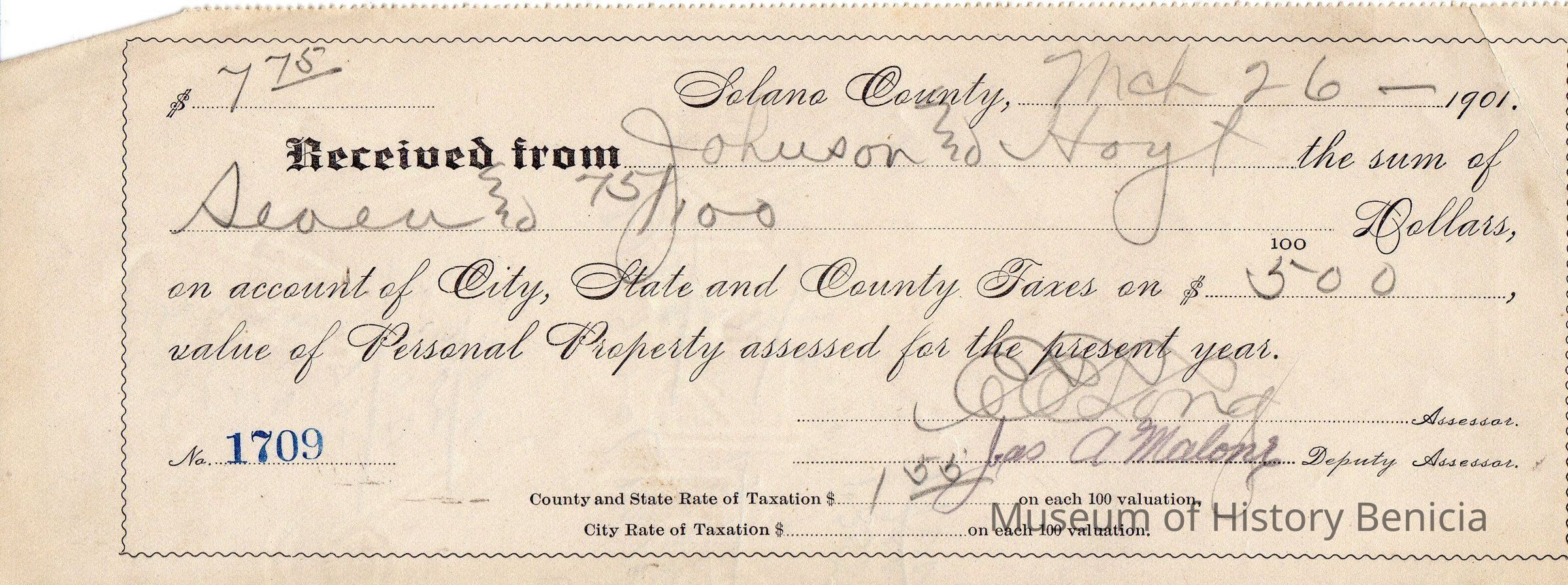 Received from Johnston and J Voyt the sum of Seventy and 75/100 Dollars an account of the city, state, and county taxes on $500 value of Pressal Property assessed for the present year