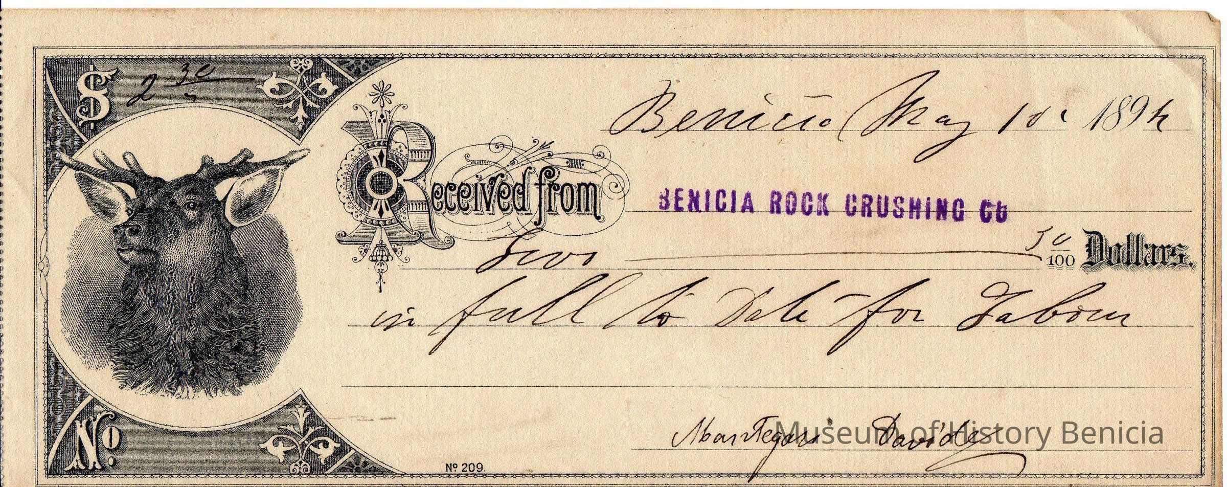 Benicia May 16 1894 Received from Benicia Rock Crushing co. Four and 50/100 No. 209
