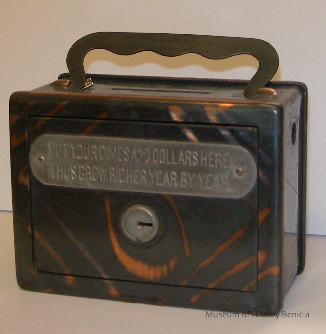 Box-shaped container has metallic grey finish w/bronze markings. Bail handle stamped "California Notion & Toy Co. SF"; slot for coins below. Front locks with a key; nickel sign stamped "Put Your Dimes + Dollars Here, / Then Grow Richer By the Year"