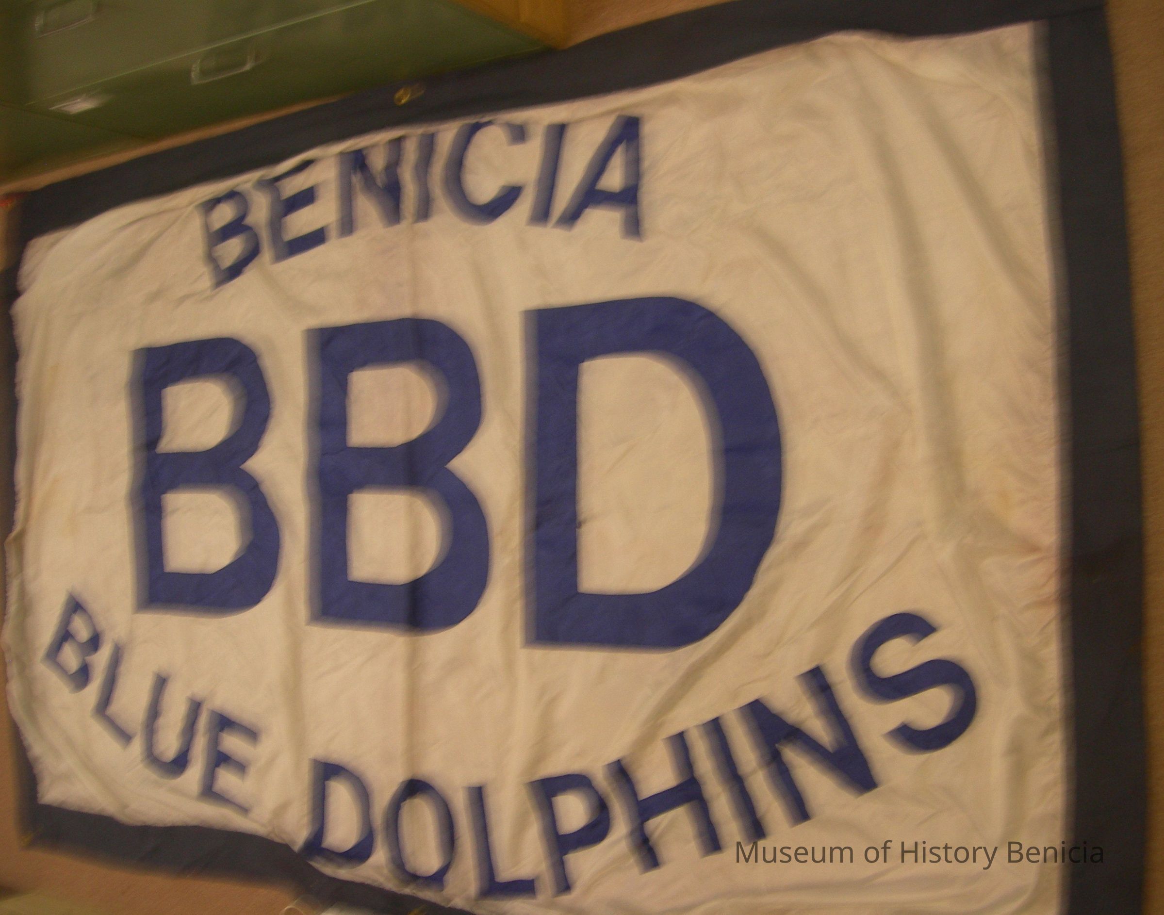 Banner - white rayon center w/sewn on blue sateen letters, border is blue cotton, 6 grommets
